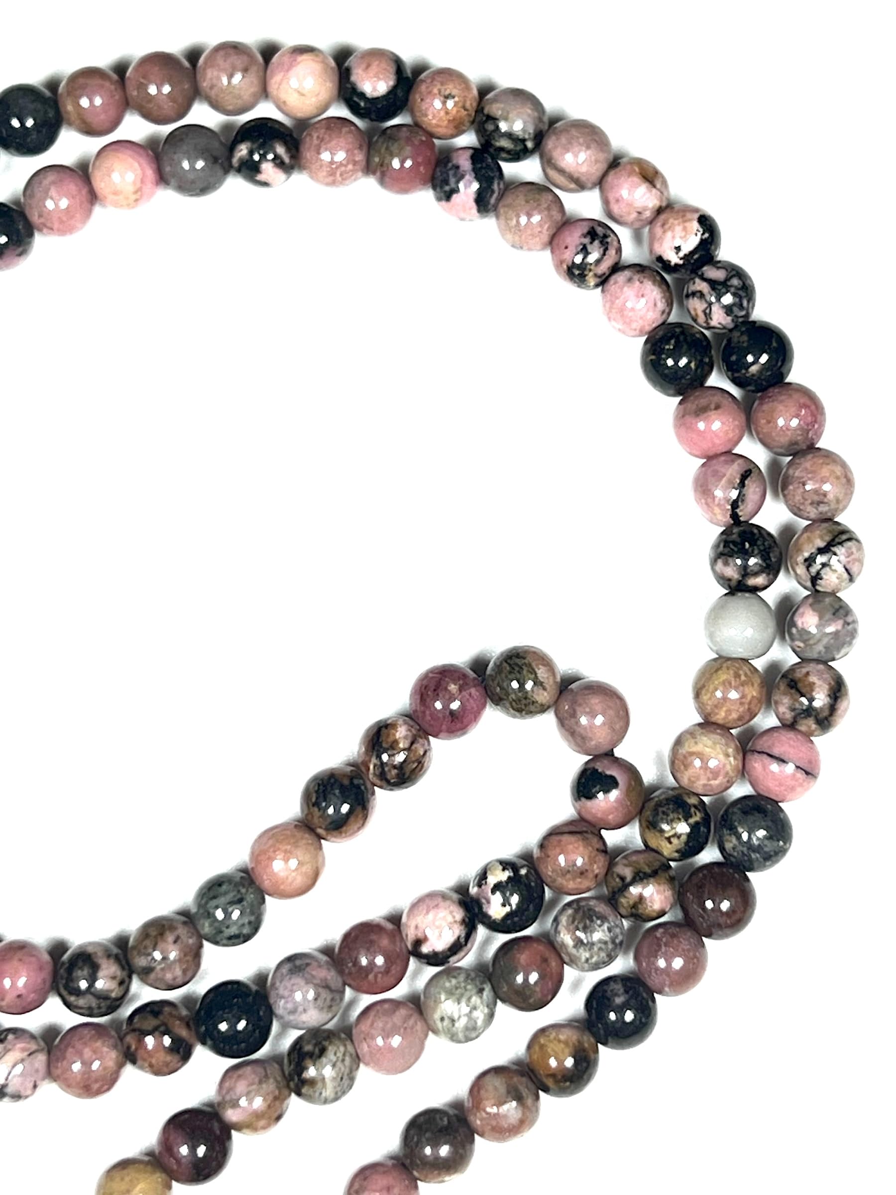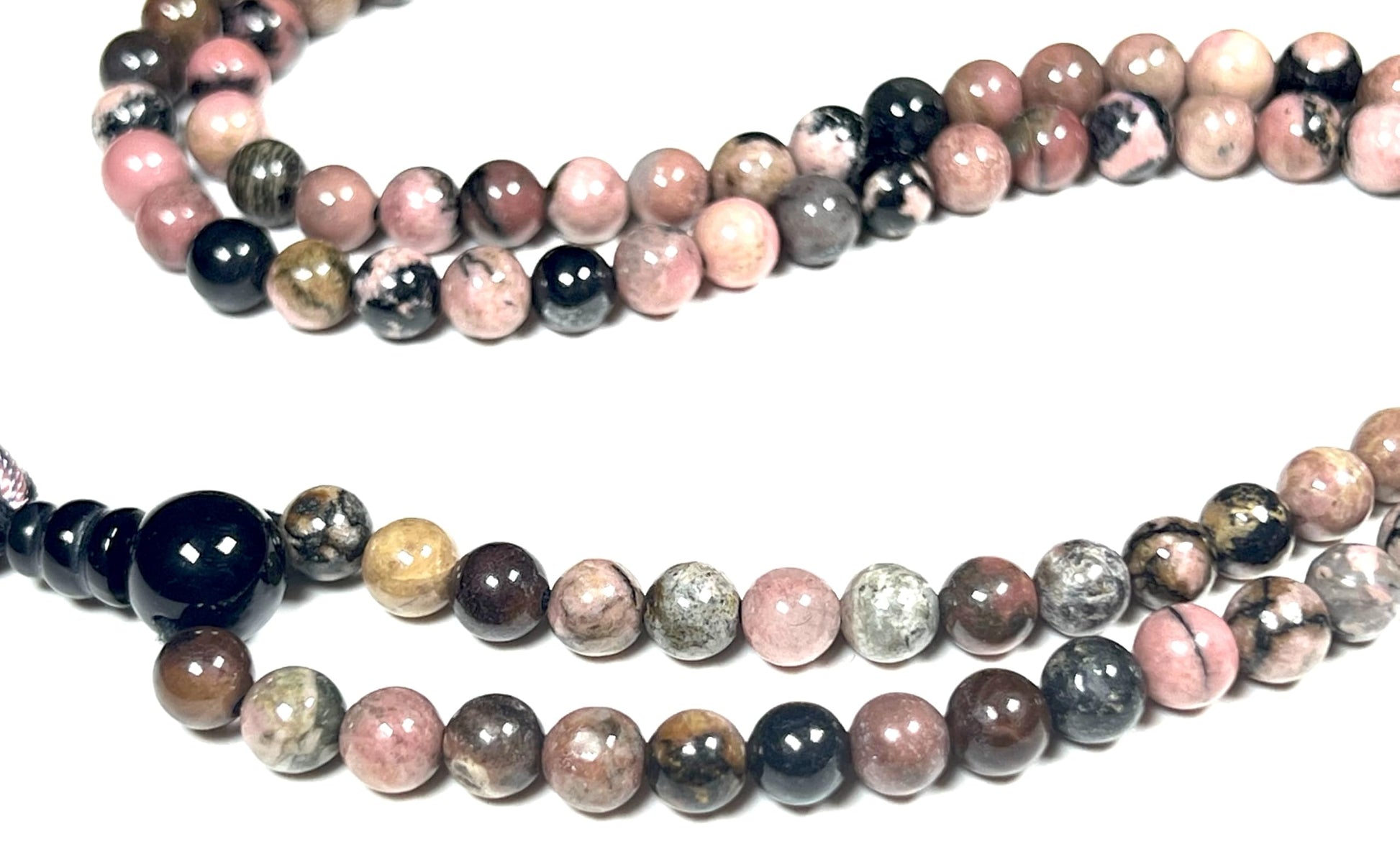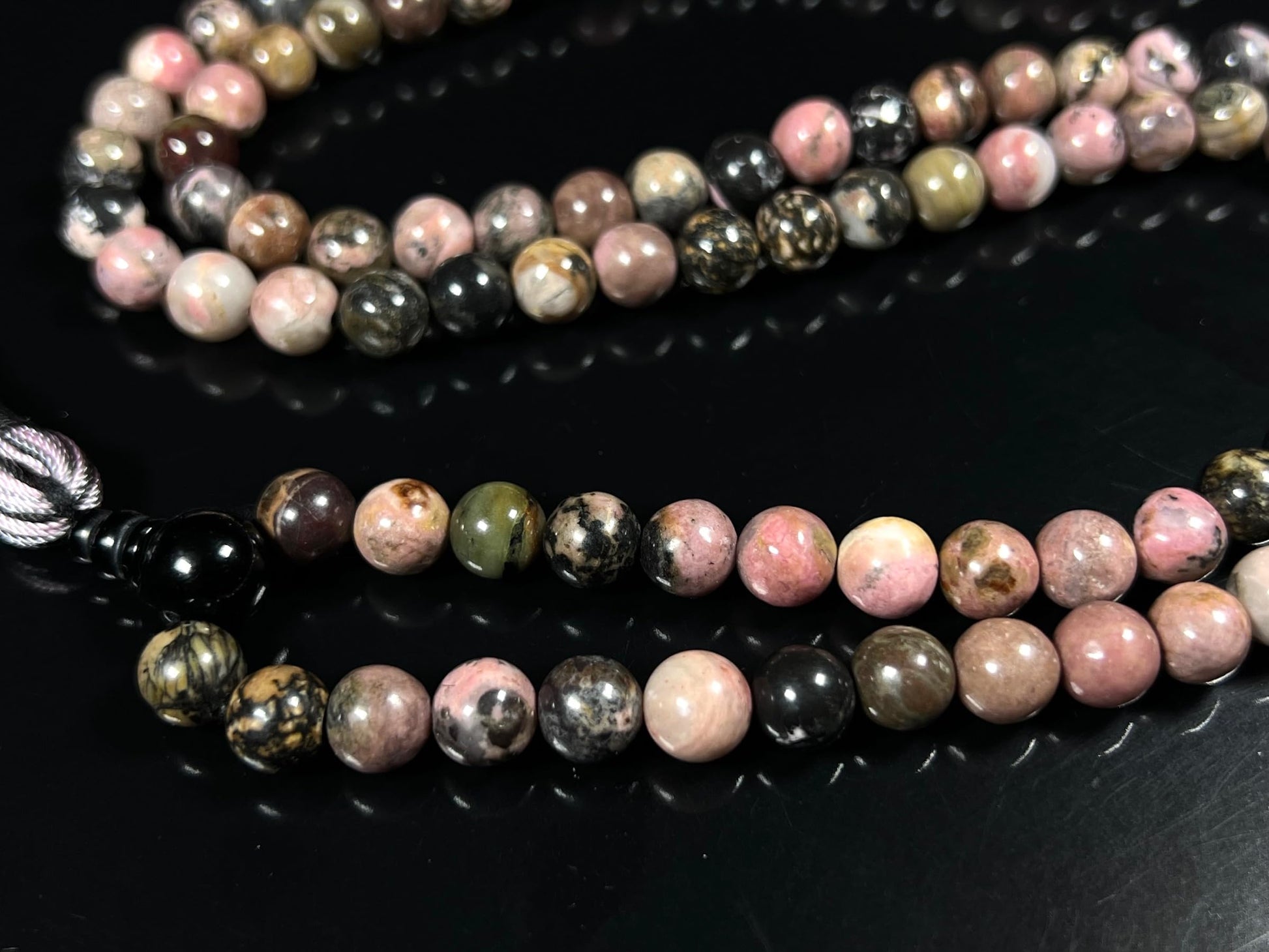 - Elevate your spiritual practice and style with our exquisite Handmade Rhodonite Mala Beads Necklace, featuring a Black Onyx Guru Bead. This stunning mala is crafted with 108 Rhodonite beads, available in 6mm and 8mm sizes, and is designed to bring balance, compassion, and emotional healing to your life. Each bead is carefully selected for its natural beauty and energy, making this mala a perfect companion for meditation, mindfulness, and personal adornment.