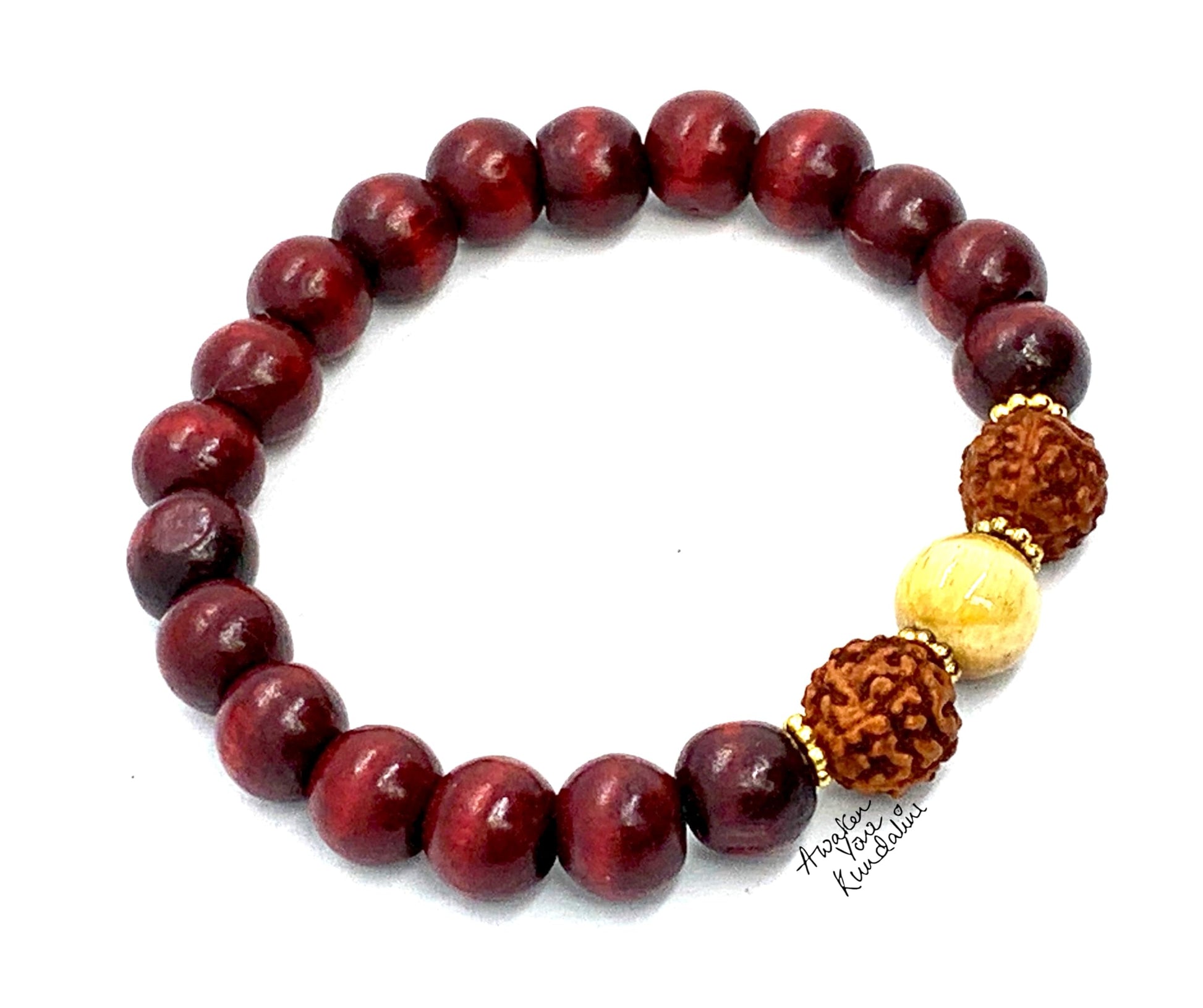 Rosewood, also known as Red Sandalwood, resonates with the Root Chakra (Muladhara) and Heart Chakra (Anahata), offering calmness, grounding, and compassion. Tiger’s Eye, a stone of courage and focus, activates the Solar Plexus Chakra (Manipura), empowering strength, confidence, and determination. 5 Mukhi Rudraksha, associated with Lord Shiva, symbolizes wisdom, protection, and the purification of the five elements, supporting balance and inner peace.