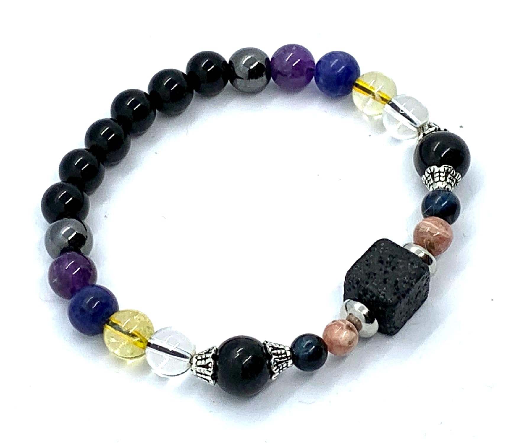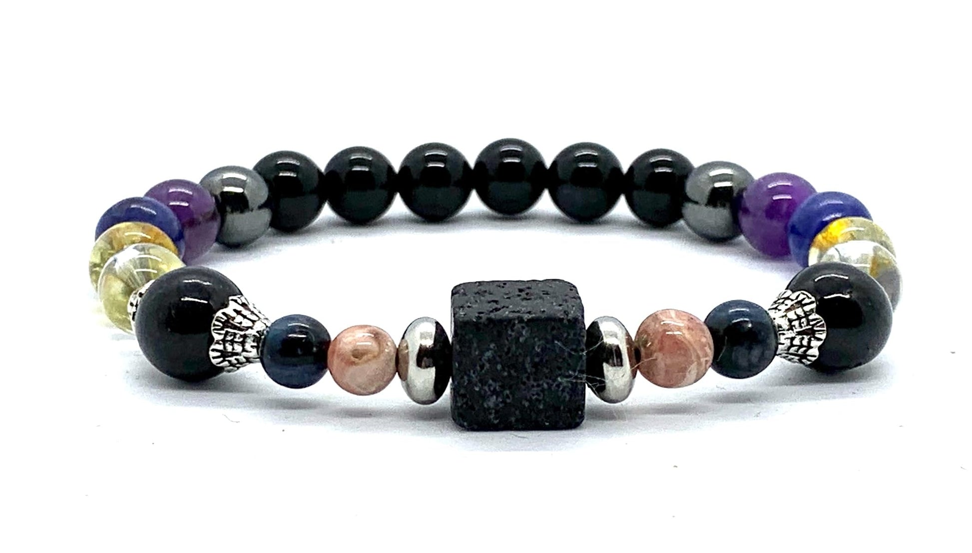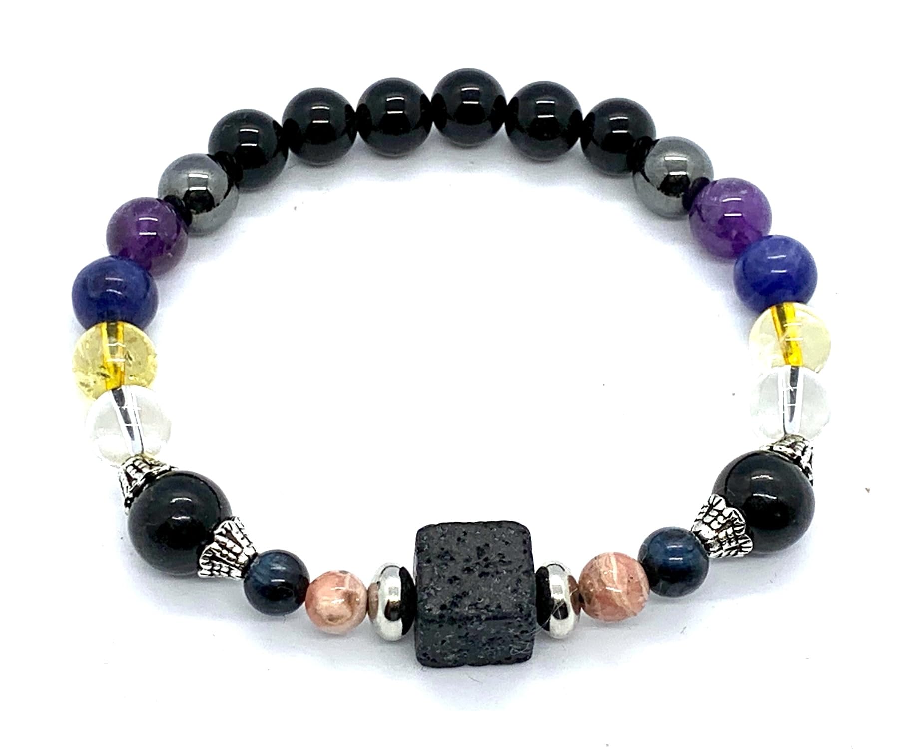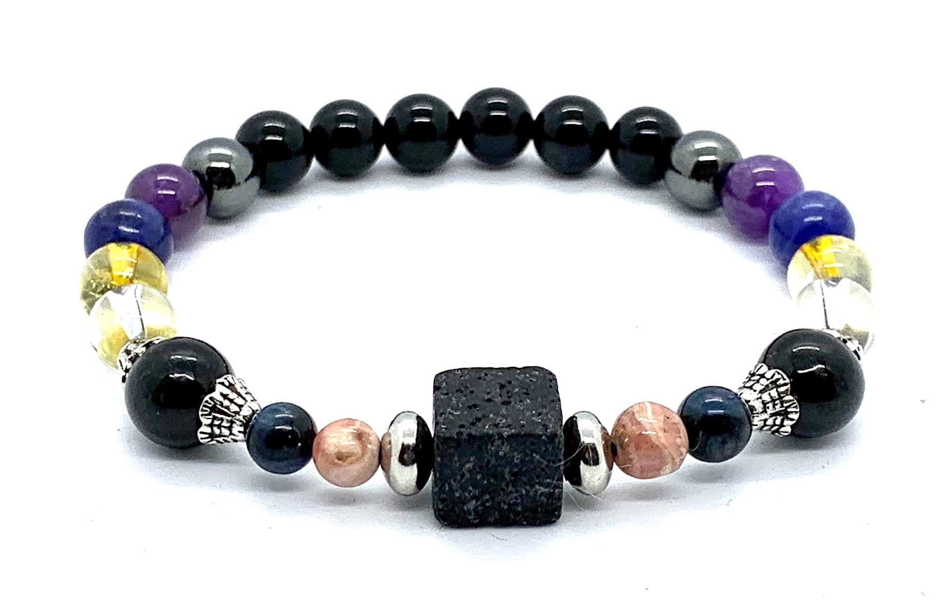 - Description: Our handcrafted Saturn Retrograde Stretch Bracelet features 8mm gemstones including Black Tourmaline, Amethyst, Lapis Lazuli, Crystal Quartz, Citrine, Hematite, along with 6mm Rhodochrosite, Kyanite, and a stunning 14mm square Lava Rock centerpiece. Adorned with silver-finish alloy spacers, this bracelet fits wrist sizes from 6-9 inches.