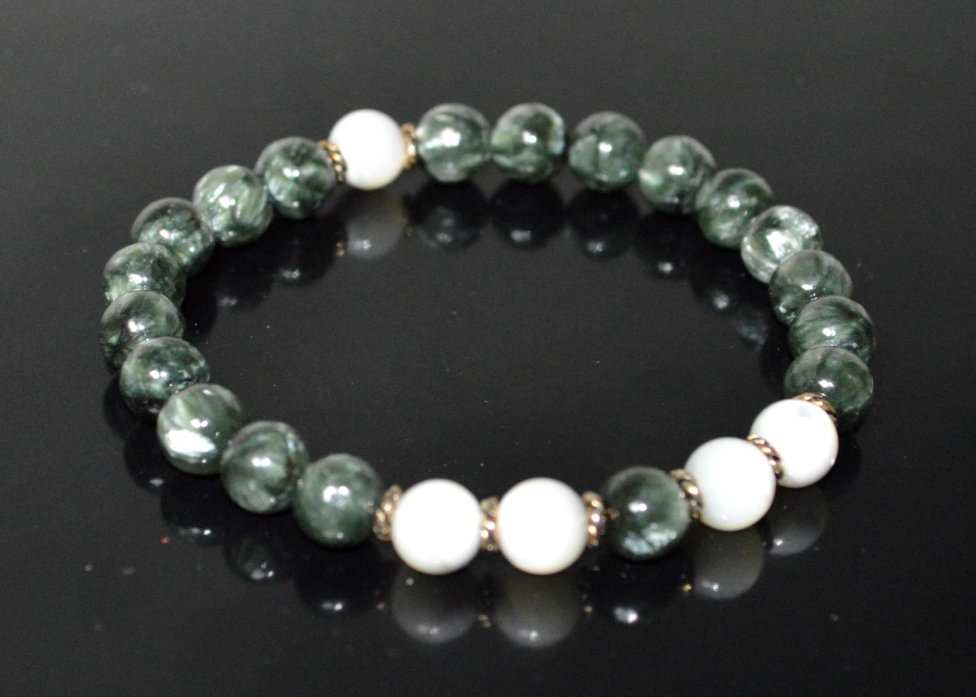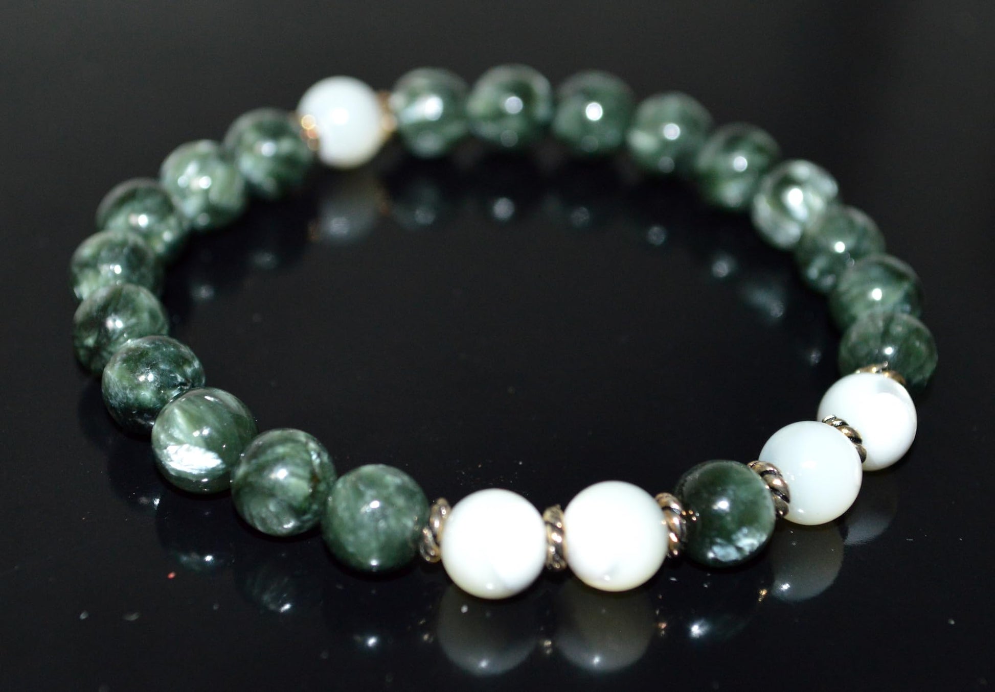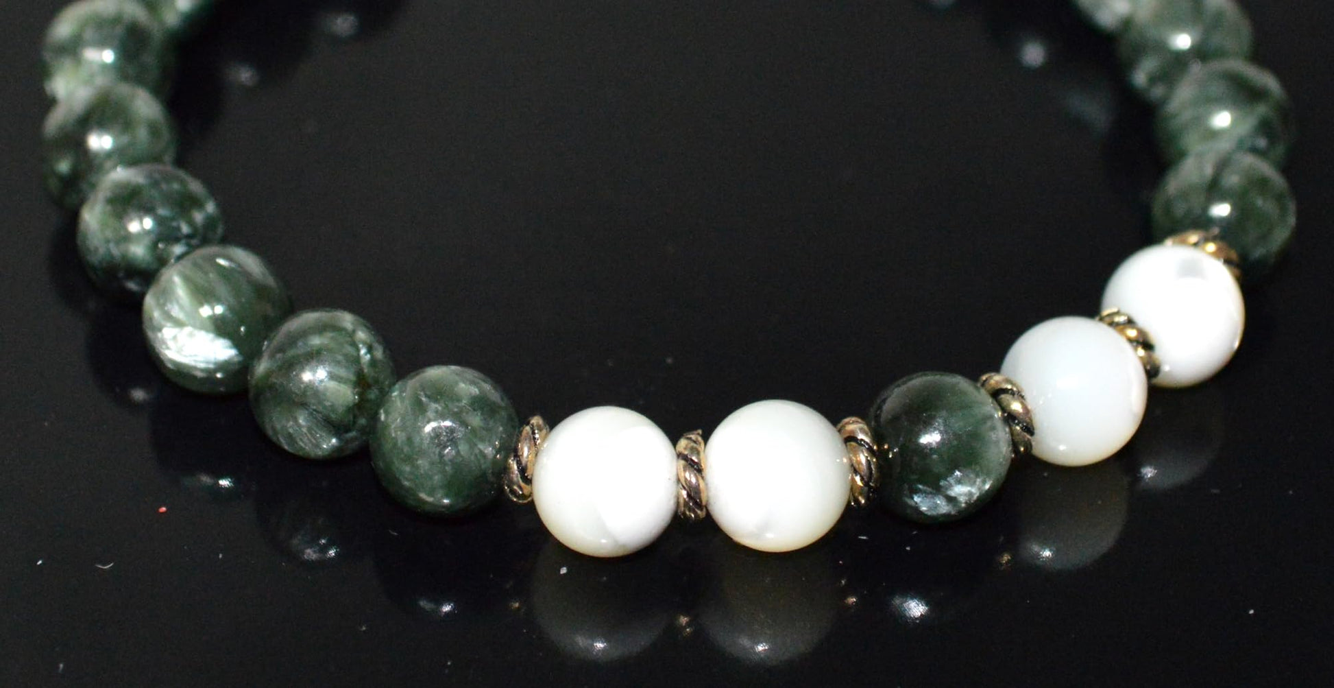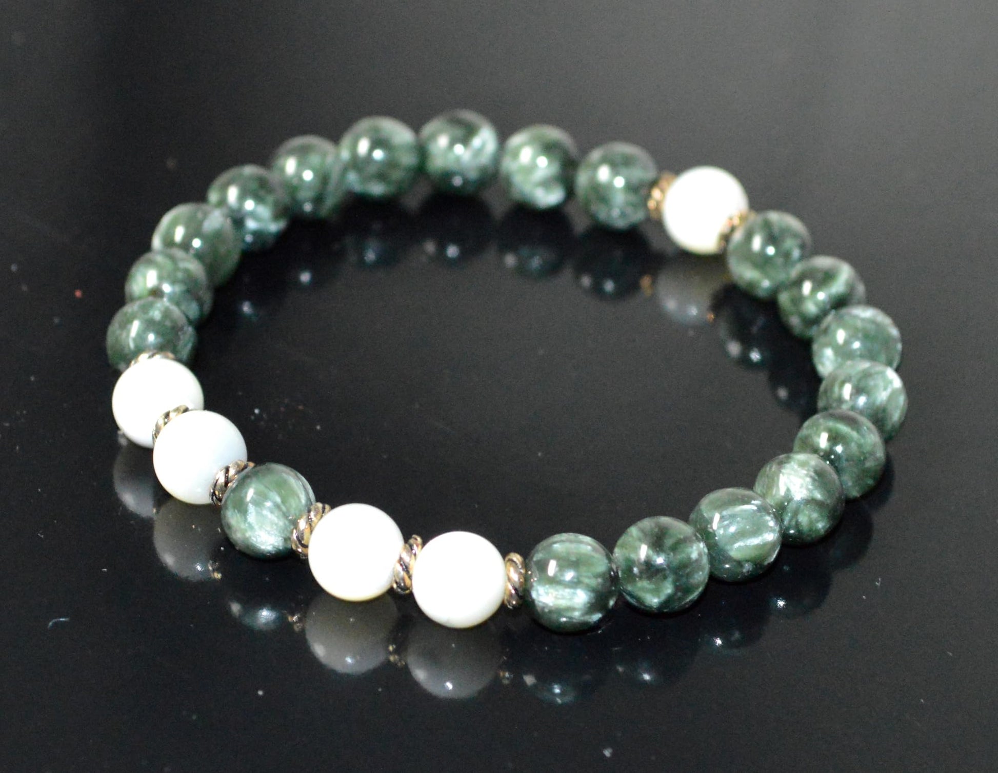 - This beautifully crafted Seraphinite and Mother of Pearl Stretch Bracelet is the perfect addition to any jewelry collection. Featuring 8mm beads made from the serene green hues of Seraphinite paired with the iridescent shine of Mother of Pearl, this bracelet embodies grace and sophistication. The brass spacers add a touch of elegance, making it a standout piece.