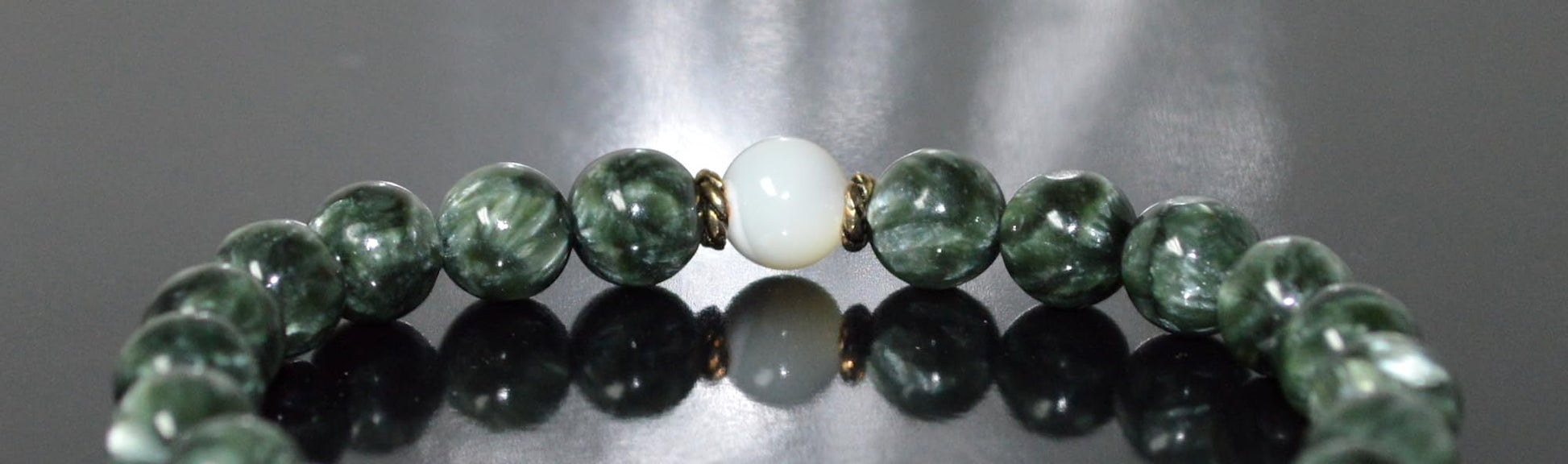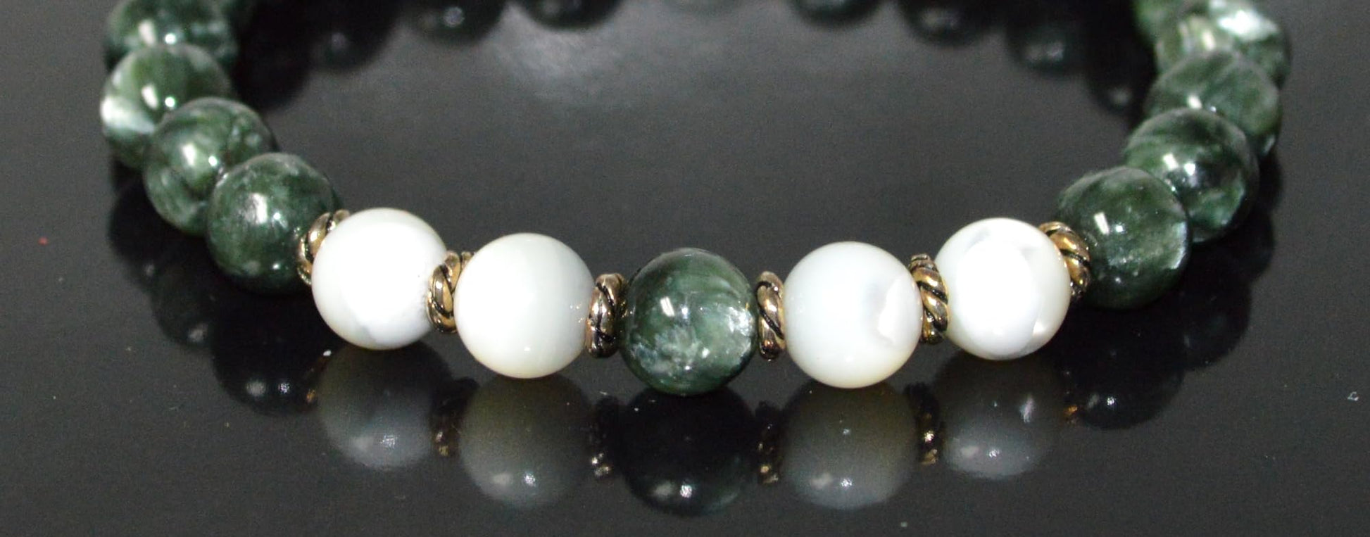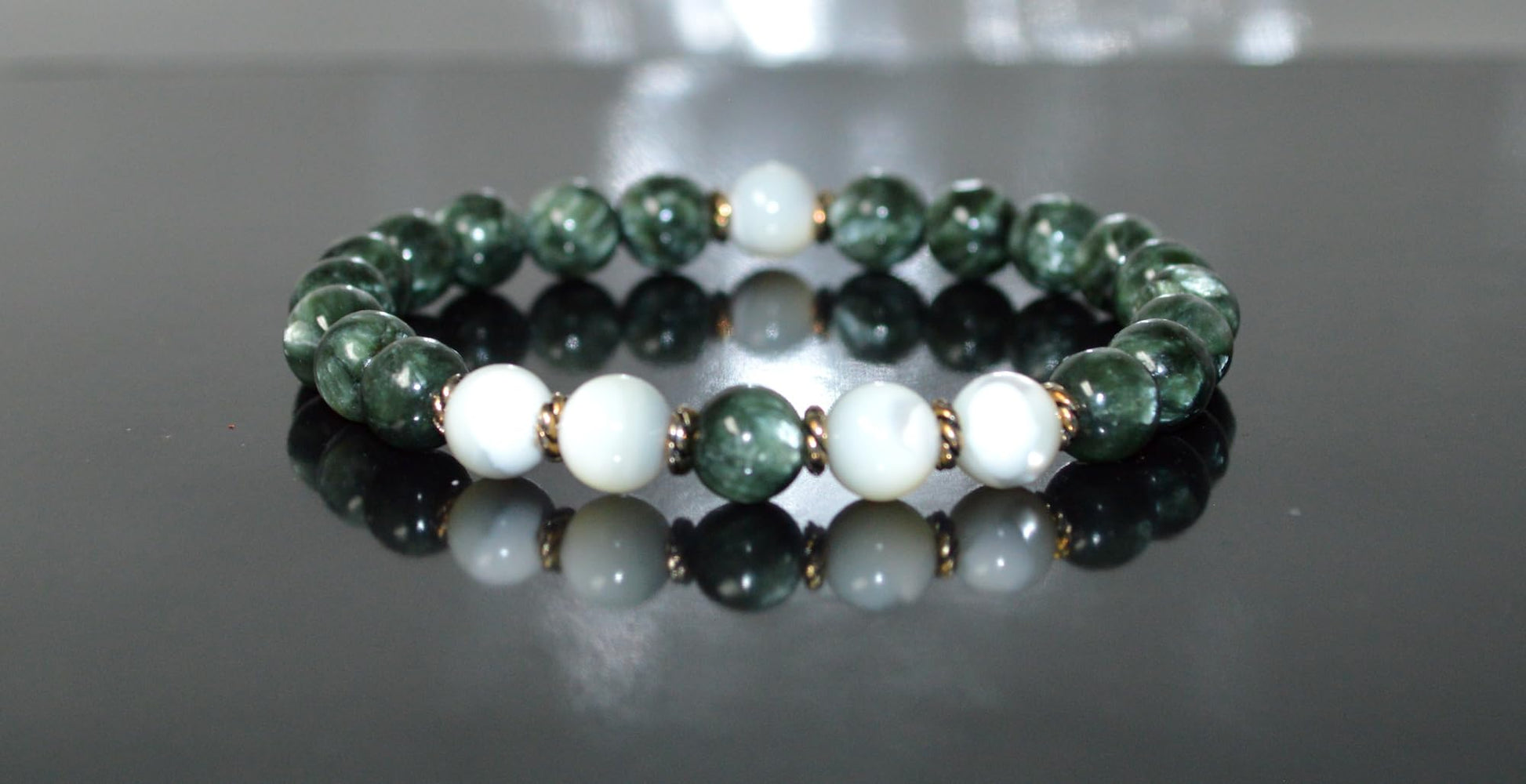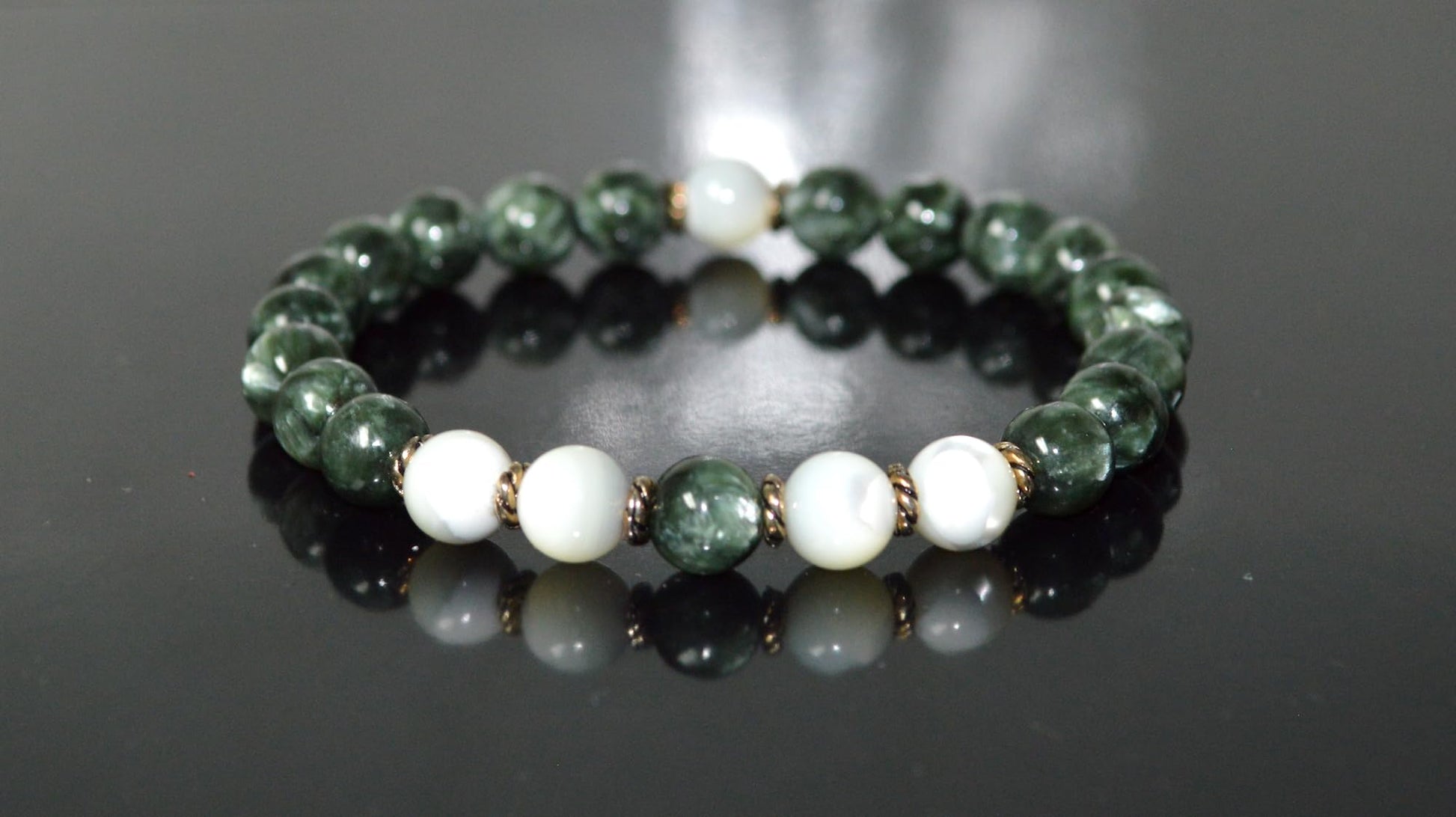 - This beautifully crafted Seraphinite and Mother of Pearl Stretch Bracelet is the perfect addition to any jewelry collection. Featuring 8mm beads made from the serene green hues of Seraphinite paired with the iridescent shine of Mother of Pearl, this bracelet embodies grace and sophistication. The brass spacers add a touch of elegance, making it a standout piece.