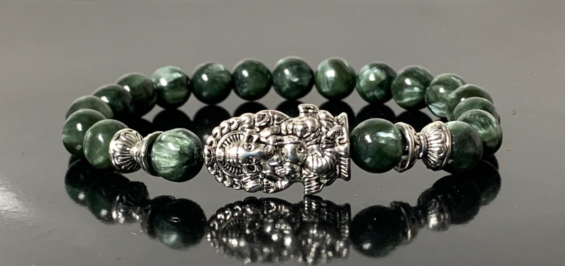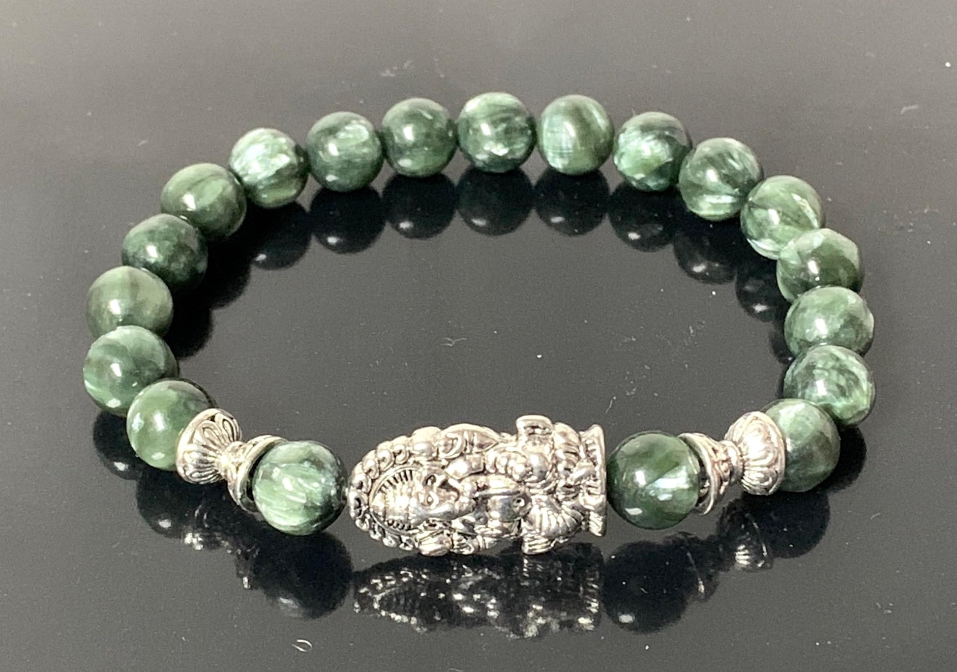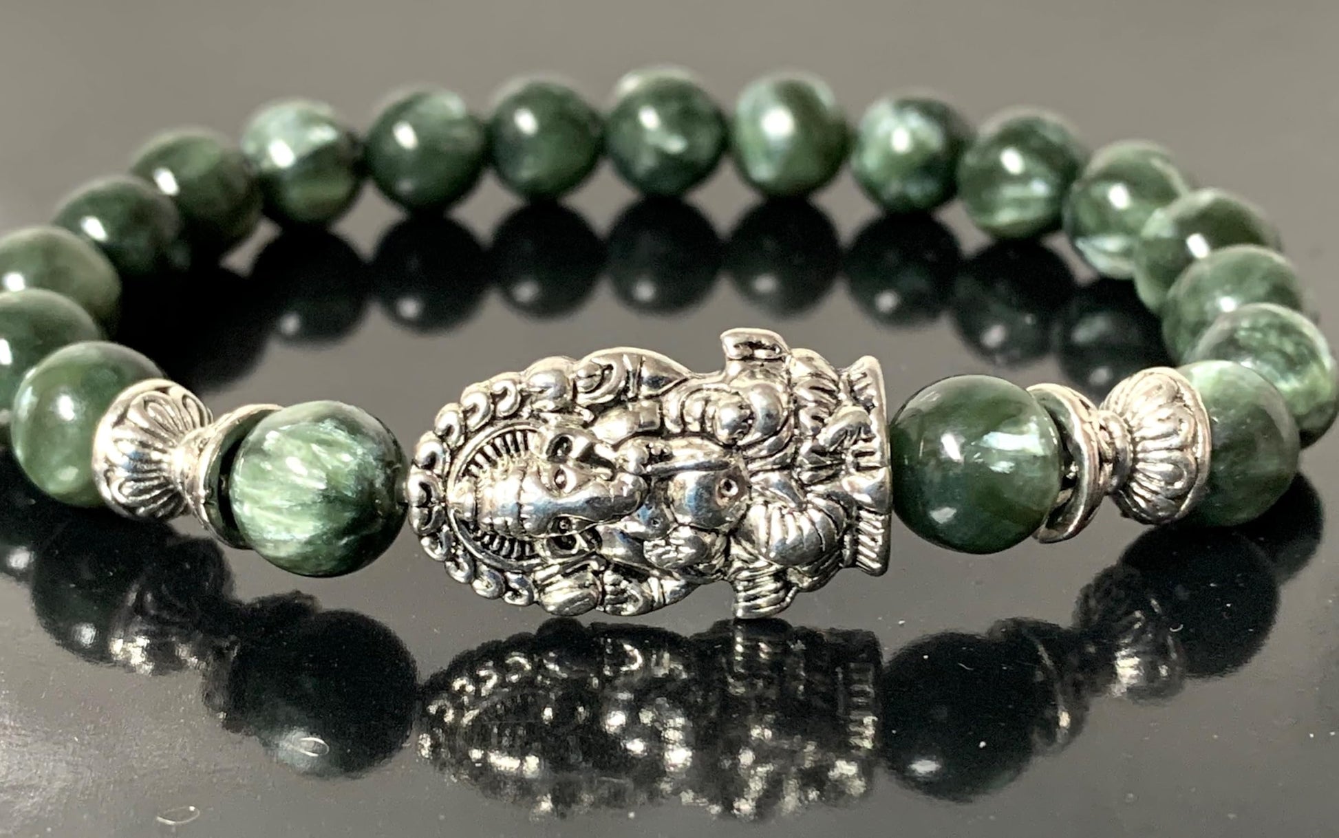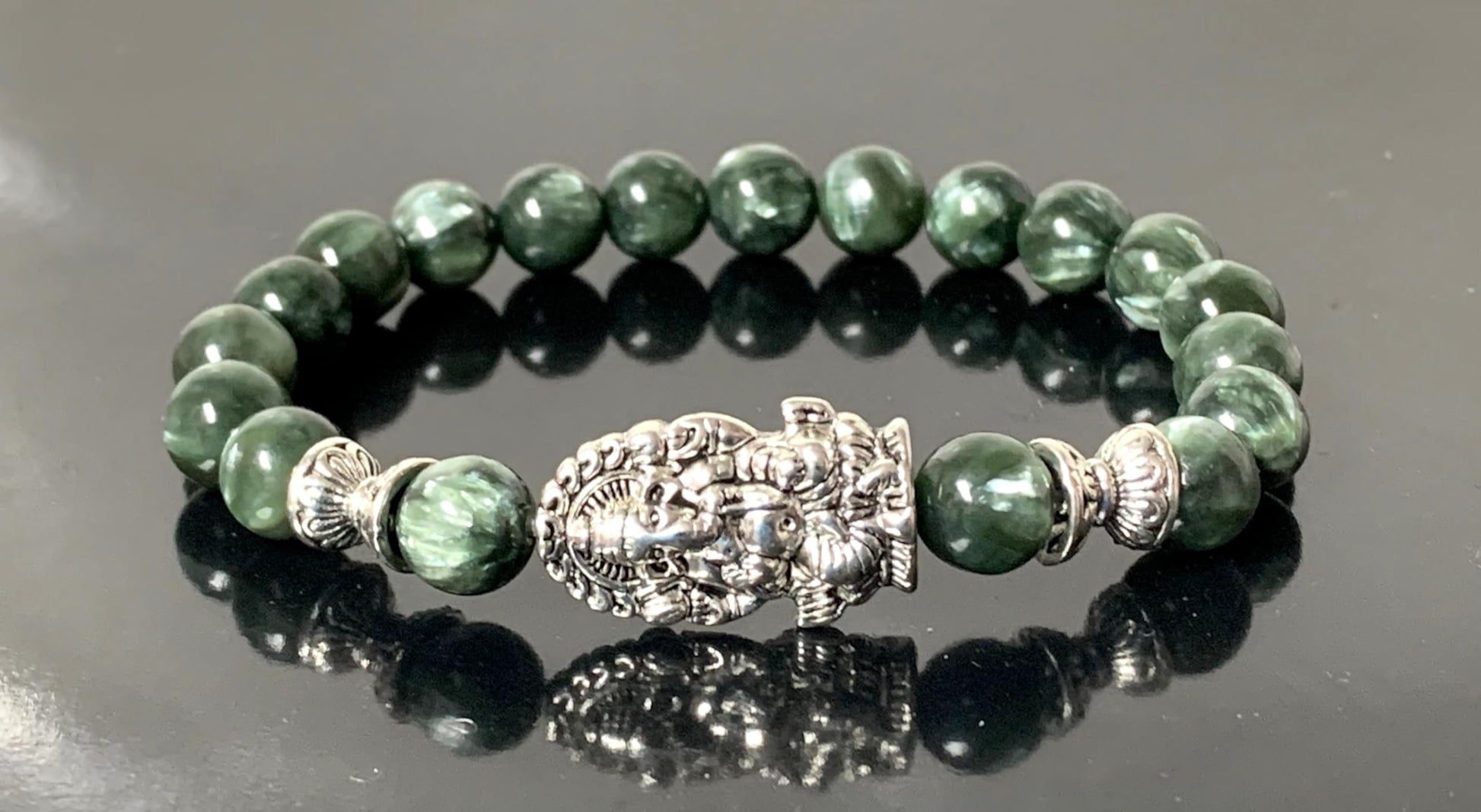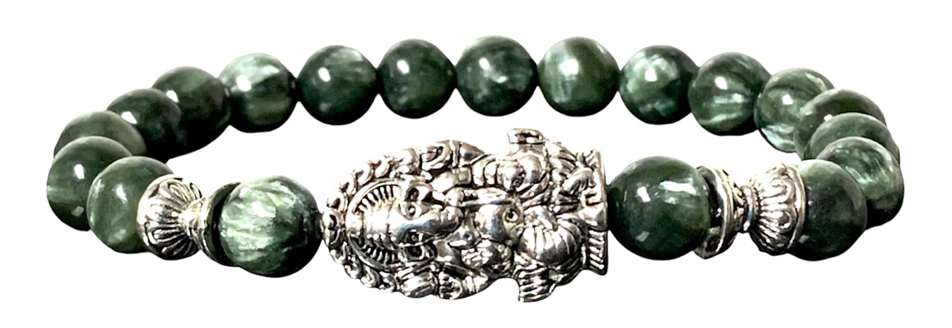 - This handcrafted 8mm Seraphinite Stretch Bracelet provides the option to choose between two divine symbols: Mother Mary with a Holy Cross or Lord Ganesha in a stunning silver finish. Seraphinite, known for its exquisite green hues and feather-like patterns, is a gemstone associated with divine wisdom and spiritual connection.