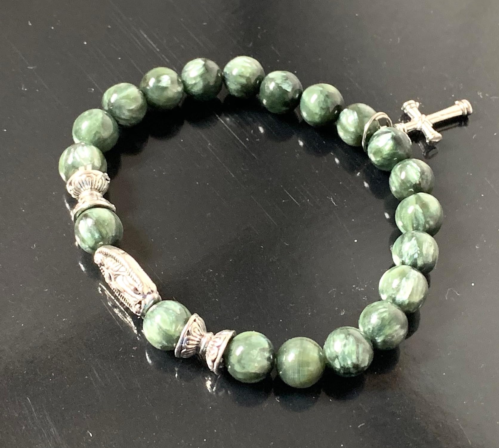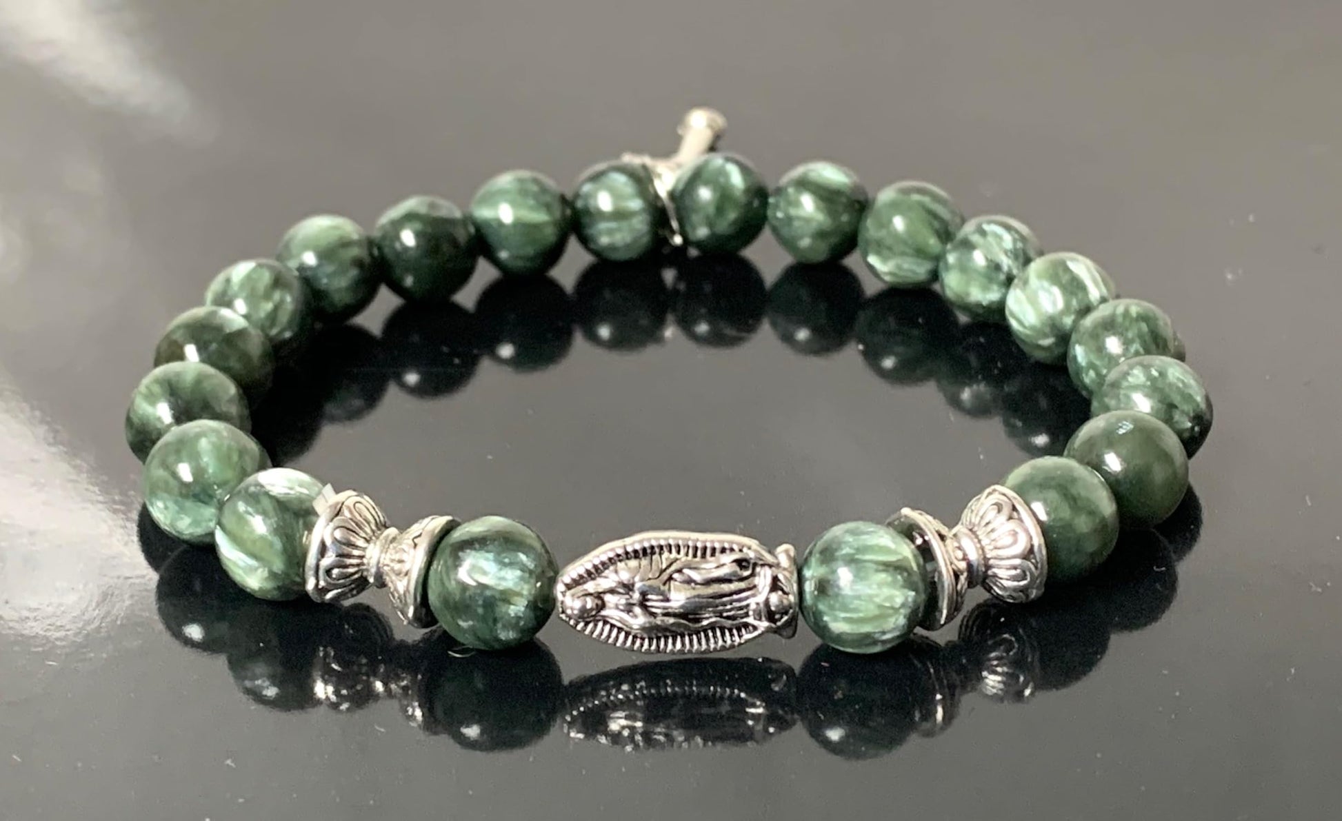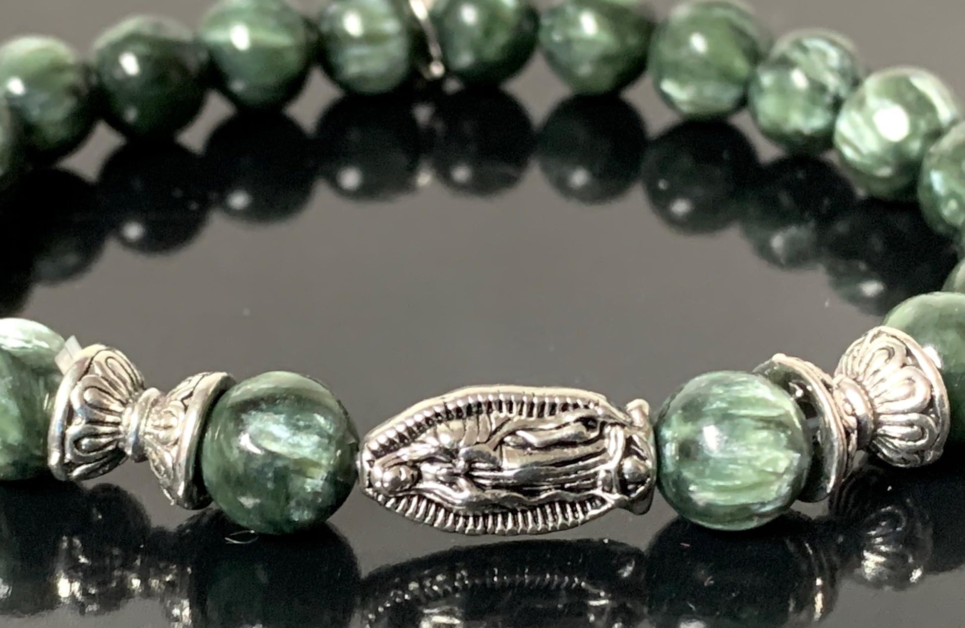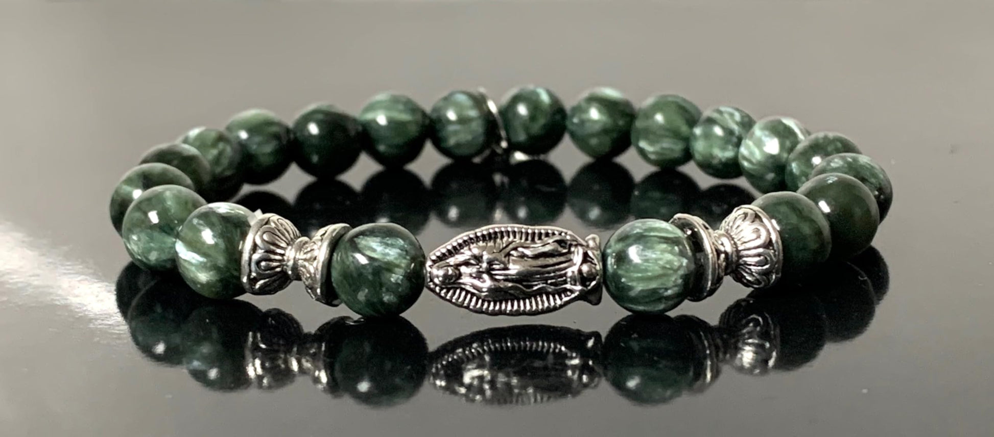 - This handcrafted 8mm Seraphinite Stretch Bracelet provides the option to choose between two divine symbols: Mother Mary with a Holy Cross or Lord Ganesha in a stunning silver finish. Seraphinite, known for its exquisite green hues and feather-like patterns, is a gemstone associated with divine wisdom and spiritual connection.