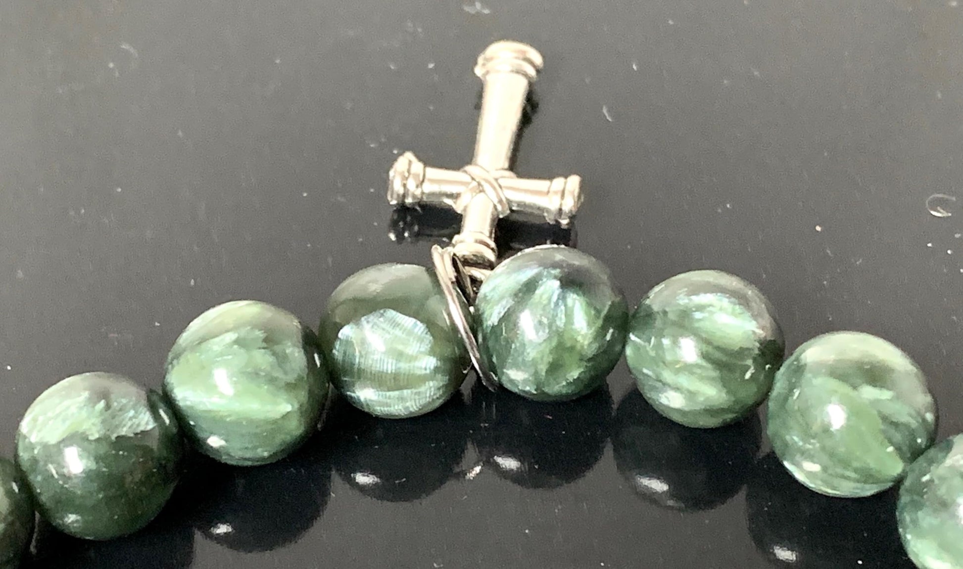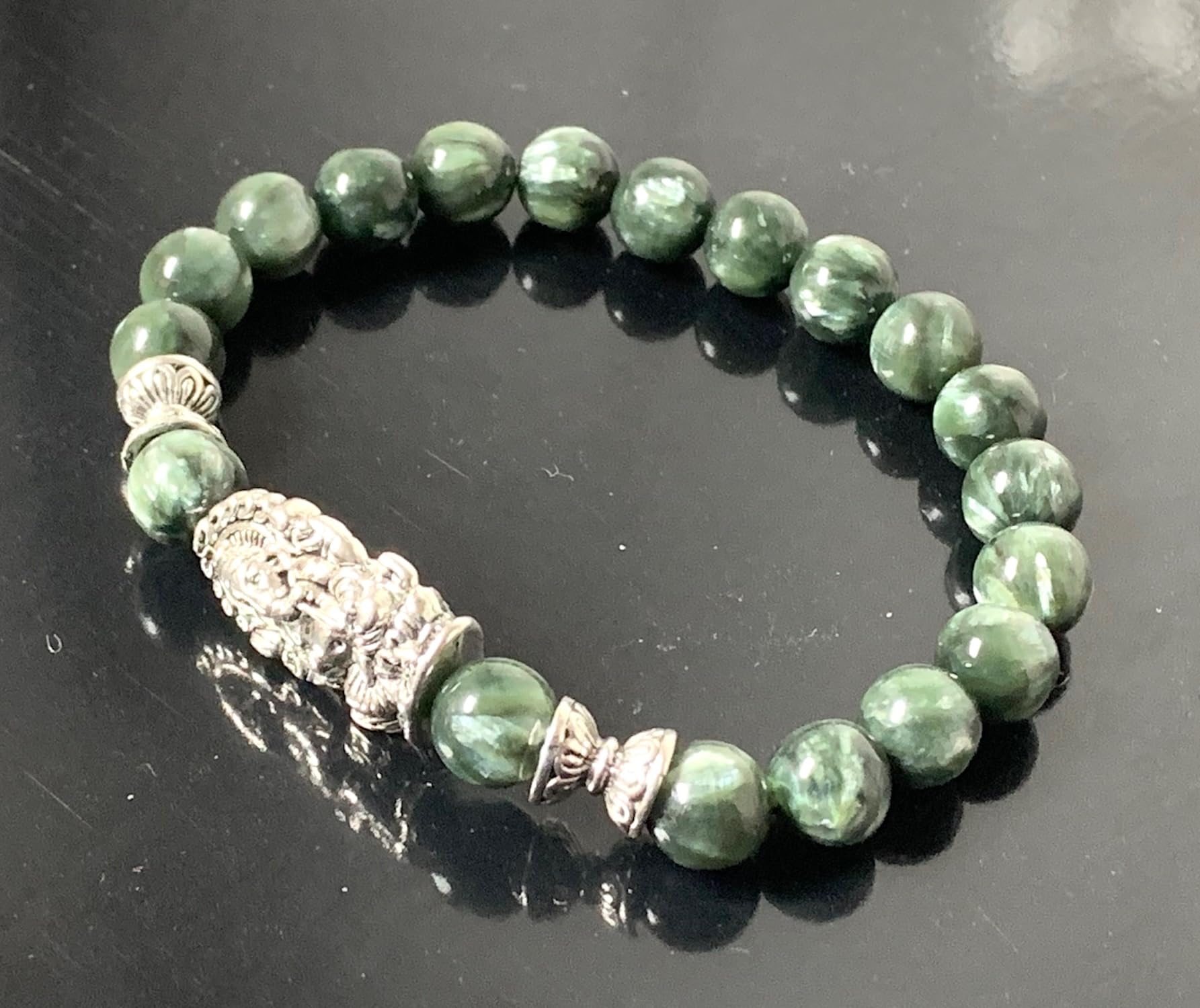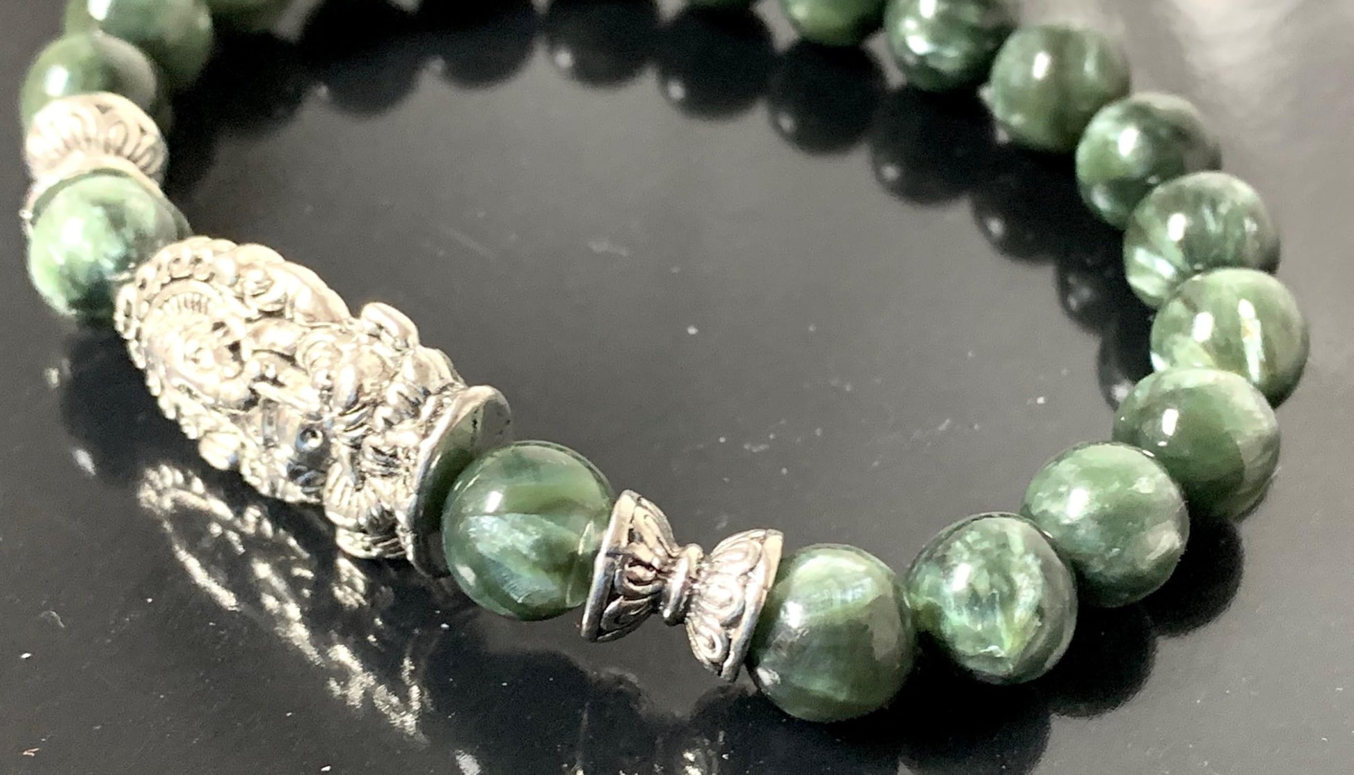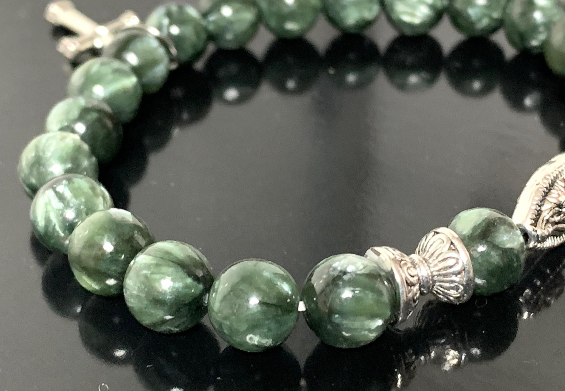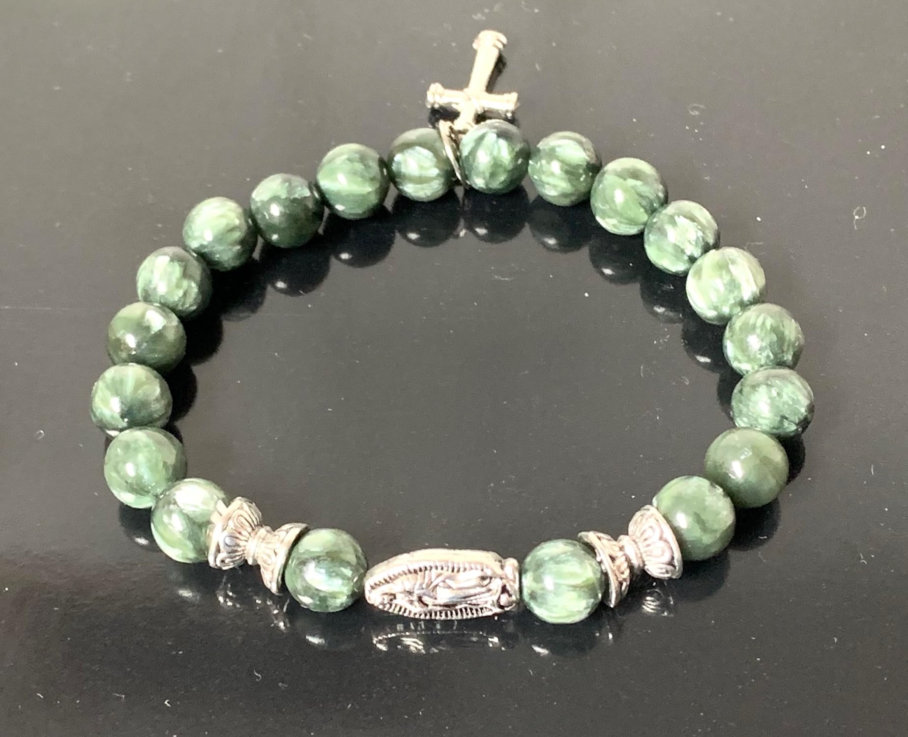 - This handcrafted 8mm Seraphinite Stretch Bracelet provides the option to choose between two divine symbols: Mother Mary with a Holy Cross or Lord Ganesha in a stunning silver finish. Seraphinite, known for its exquisite green hues and feather-like patterns, is a gemstone associated with divine wisdom and spiritual connection.