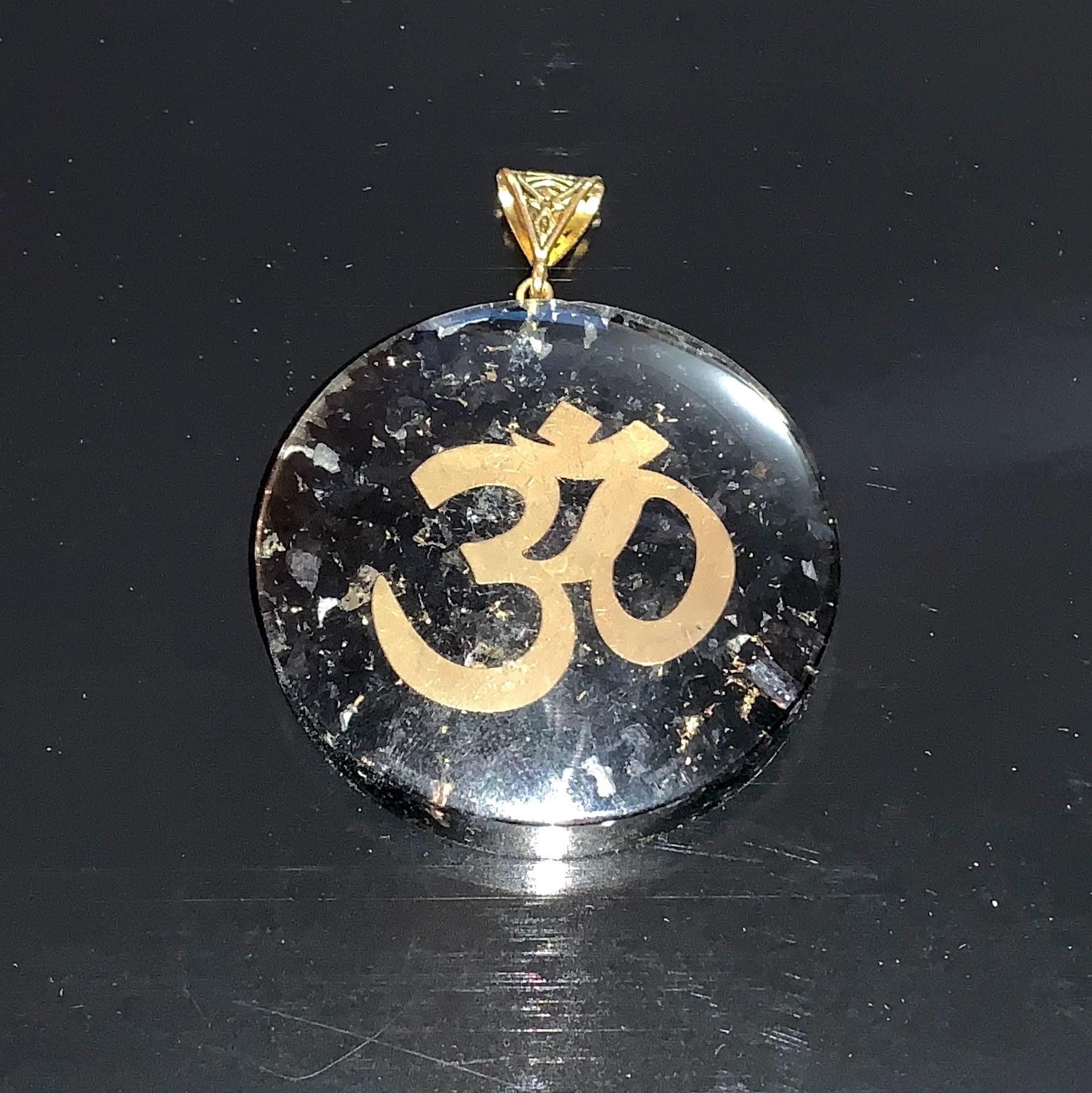 Shungite Om Symbol Orgone Pendant Necklace, 2 Inch Diameter, Aquarius Gemstone, Root & Crown Chakra