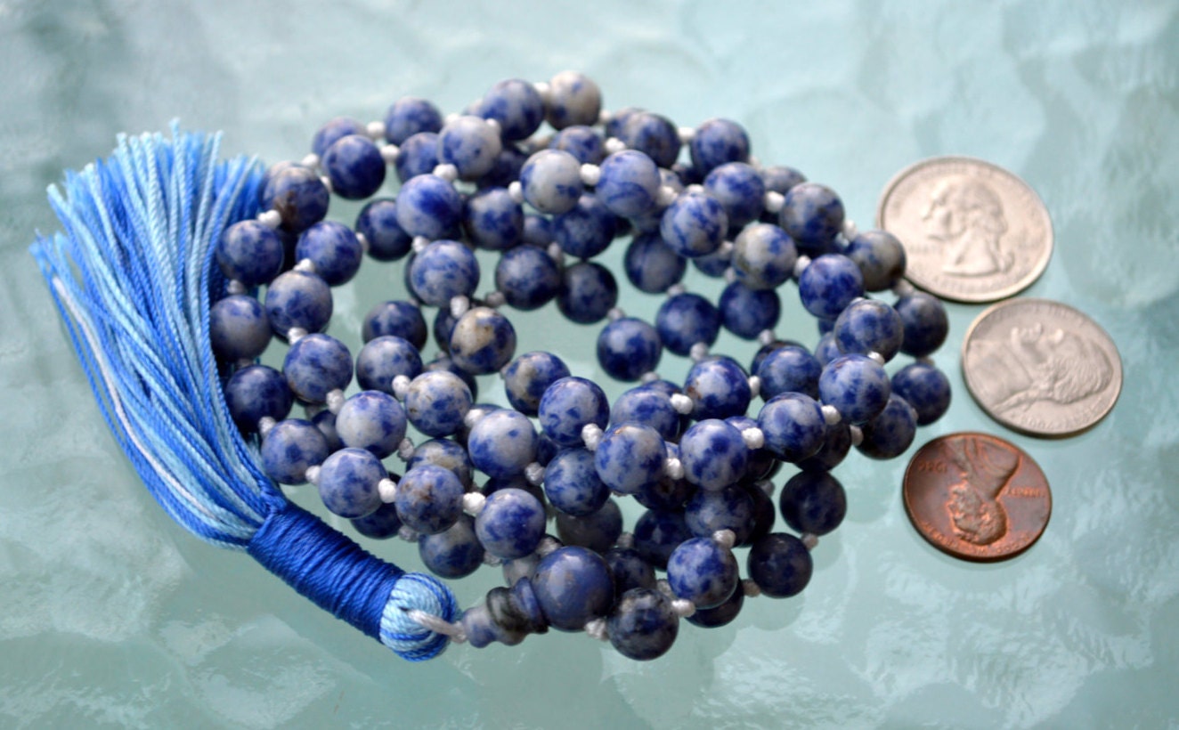 Awaken Your Kundalini RARE SODALITE PRAYER BEADS JAPA JAAP MALA PREMIUM QUALITY TOP GRADE 8 MM (108+1) HINDU TIBETAN BUDDHIST PRAYER KARMA BEADS SUBHA ROSARY MALA FOR NIRVANA, BHAKTI, FOR REMOVING INNER DOSHAS, FOR CHANTING AUM OM, FOR AWAKENING CHAKRAS, KUNDALINI THROUGH YOGA MEDITATION.