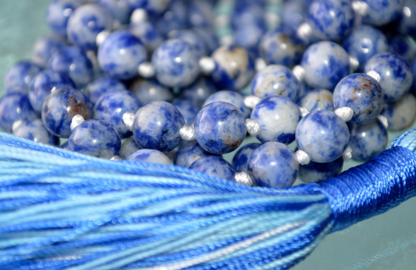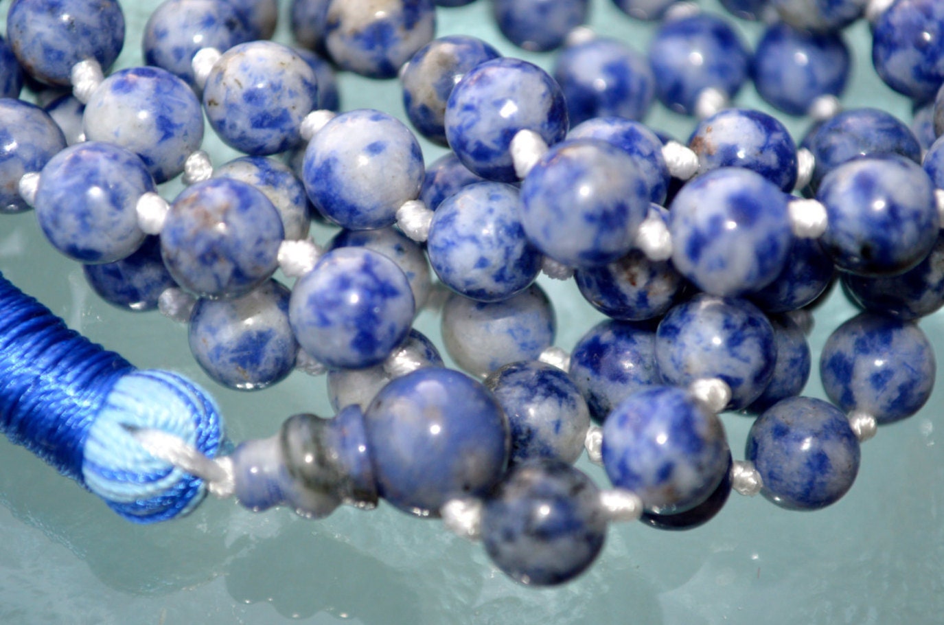 Sodalite Hand Knotted Mala Beads Necklace to Overcome Fears, Helps get rid of Guilty feelings and Irrational Fears, Sodalite Healing Beads