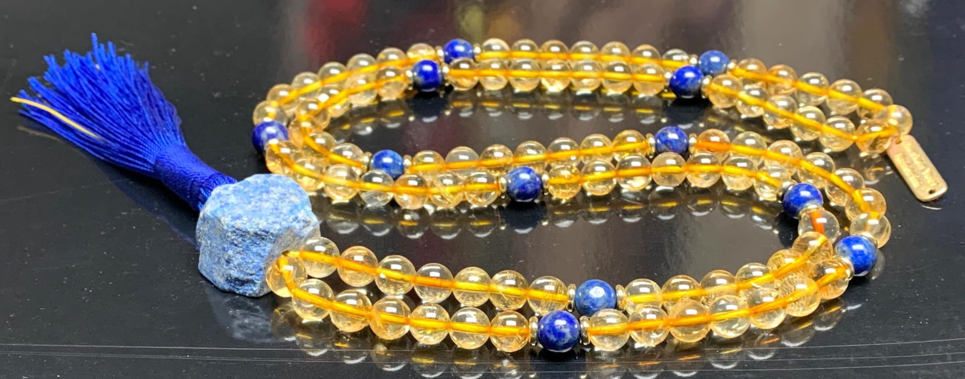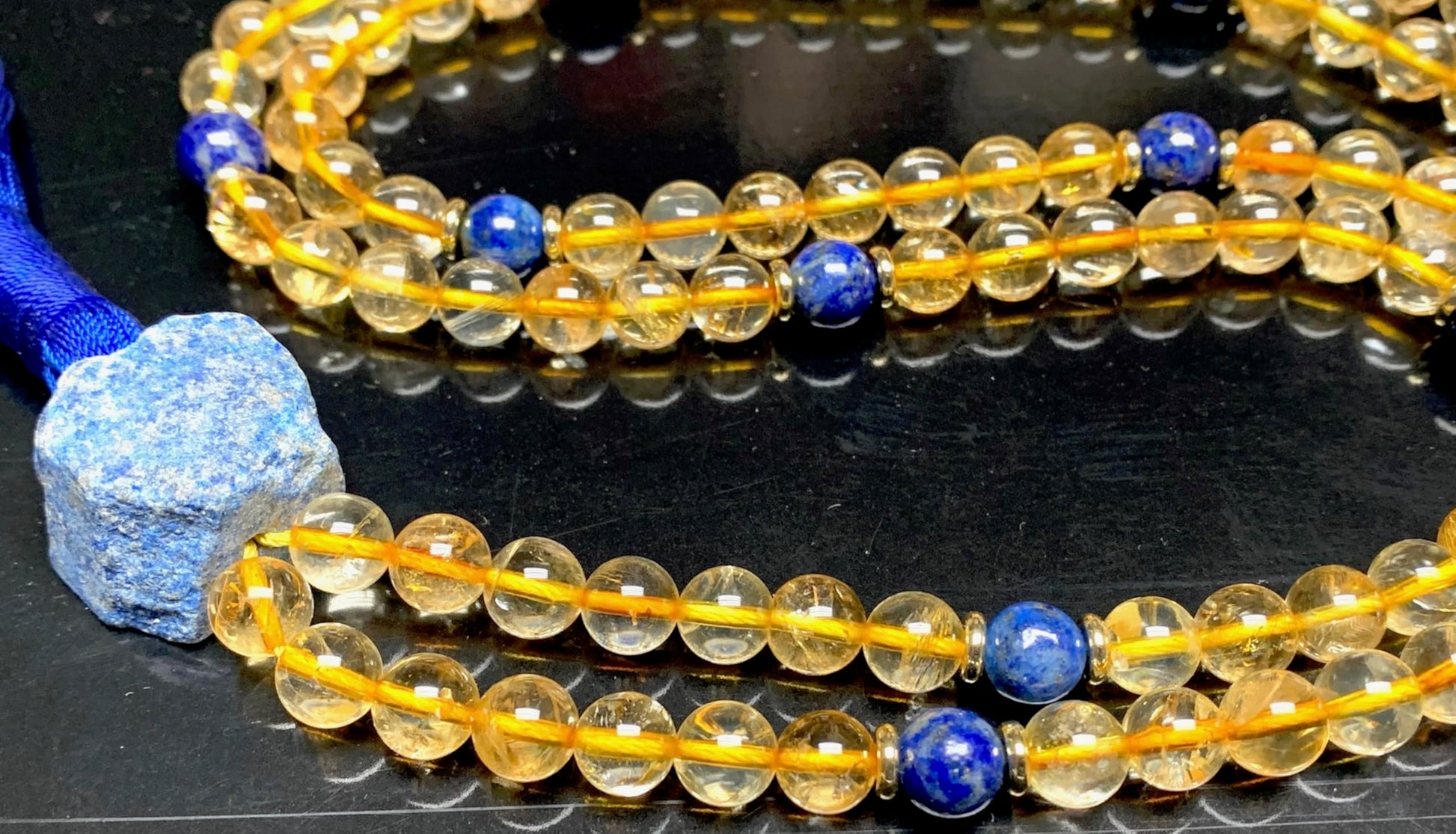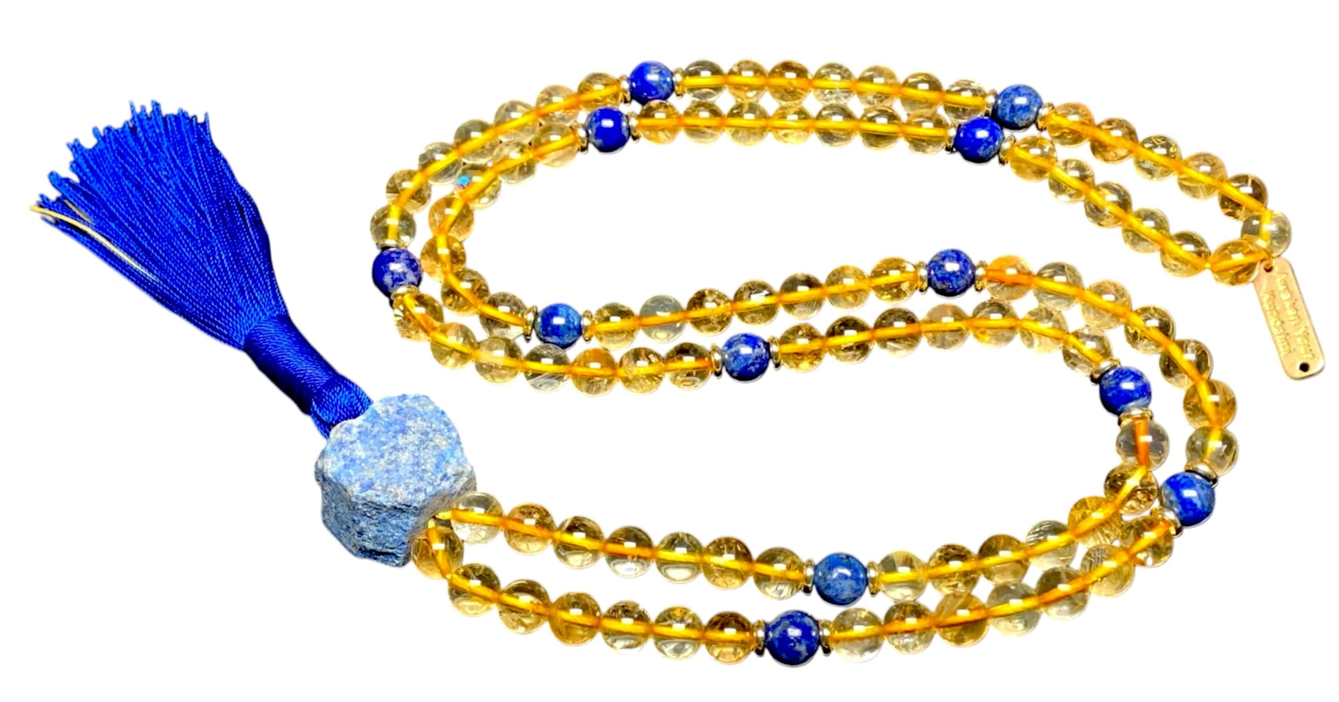 - Key Features: ✅ 108 High-Grade Beads (Citrine + Lapis Lazuli, 8mm). ✅ One-of-a-Kind Raw Lapis Lazuli Guru Bead. ✅ Subtle Gold-Tone Spacers for Elegant Transitions. ✅ 36-40" Adjustable Length (Triple-Wrap Versatility). ✅ Velvet Storage Pouch Included.