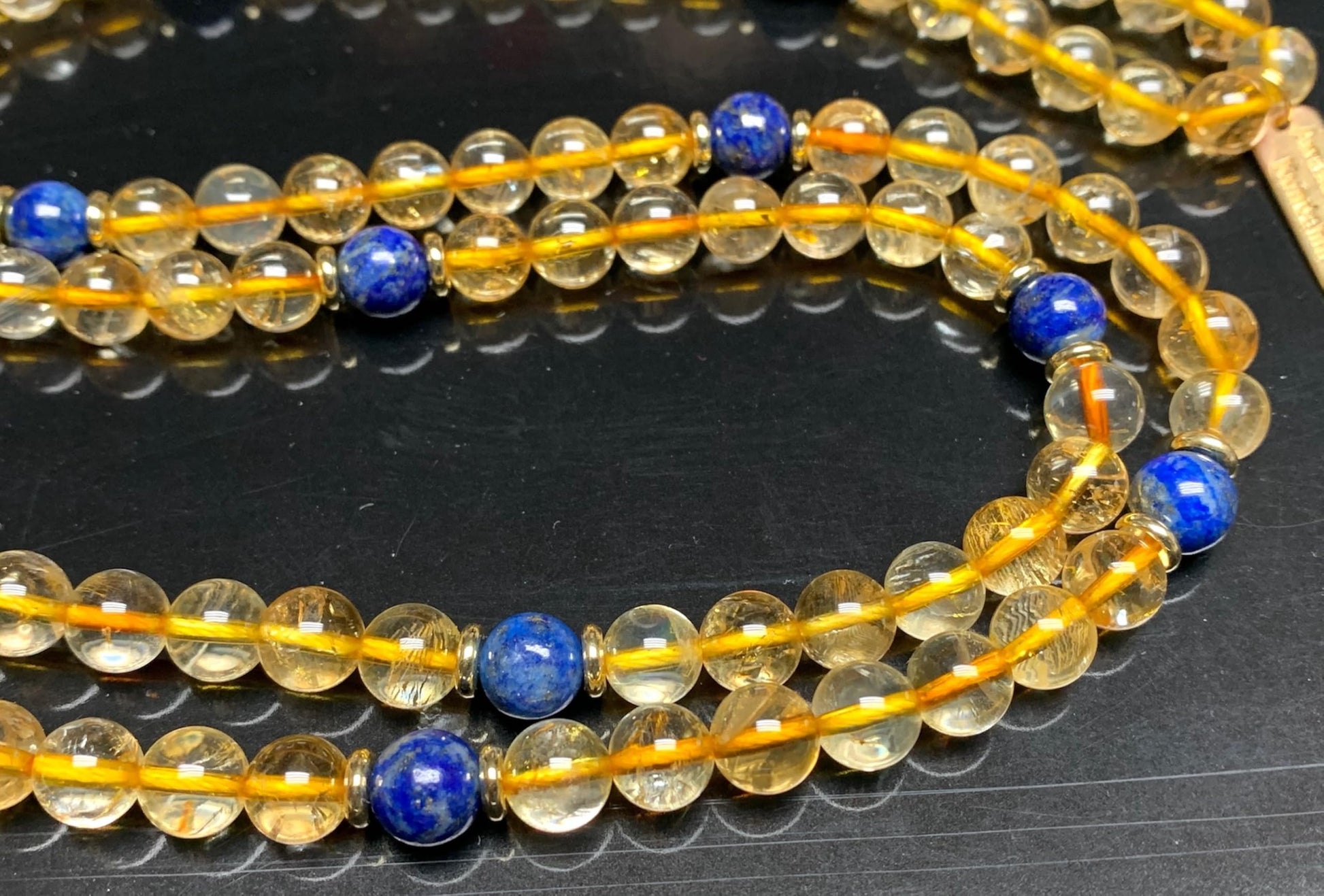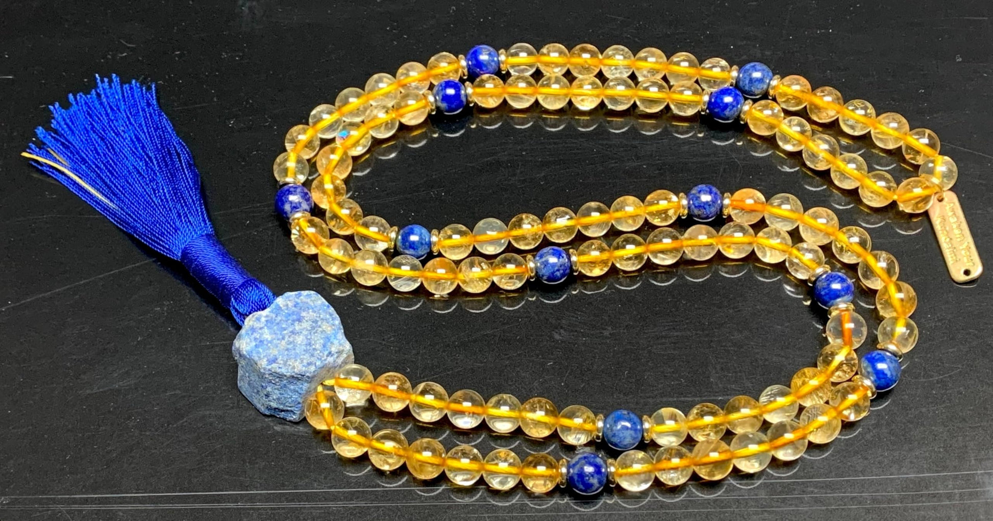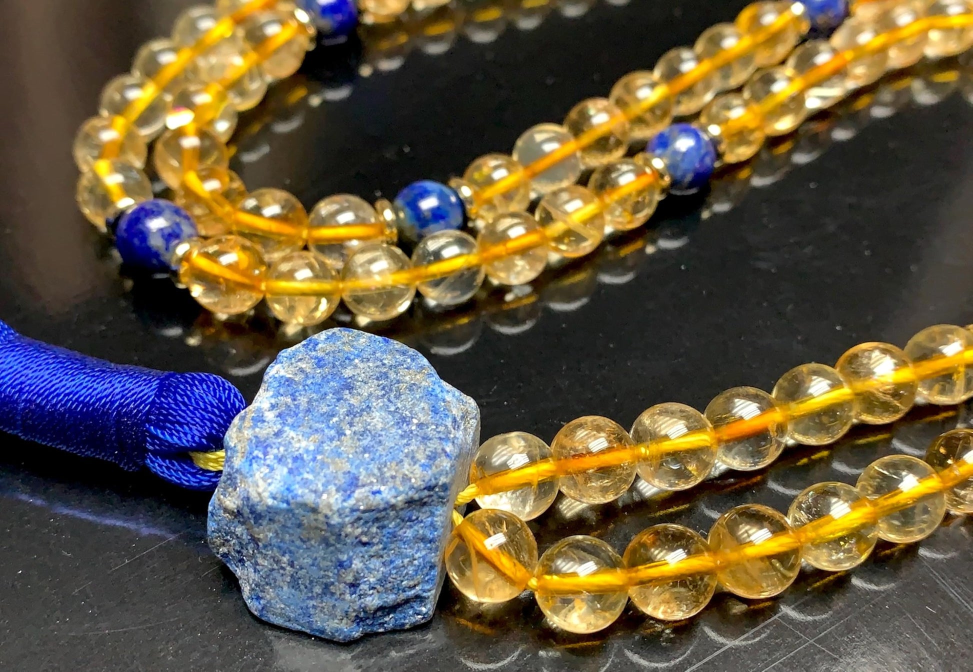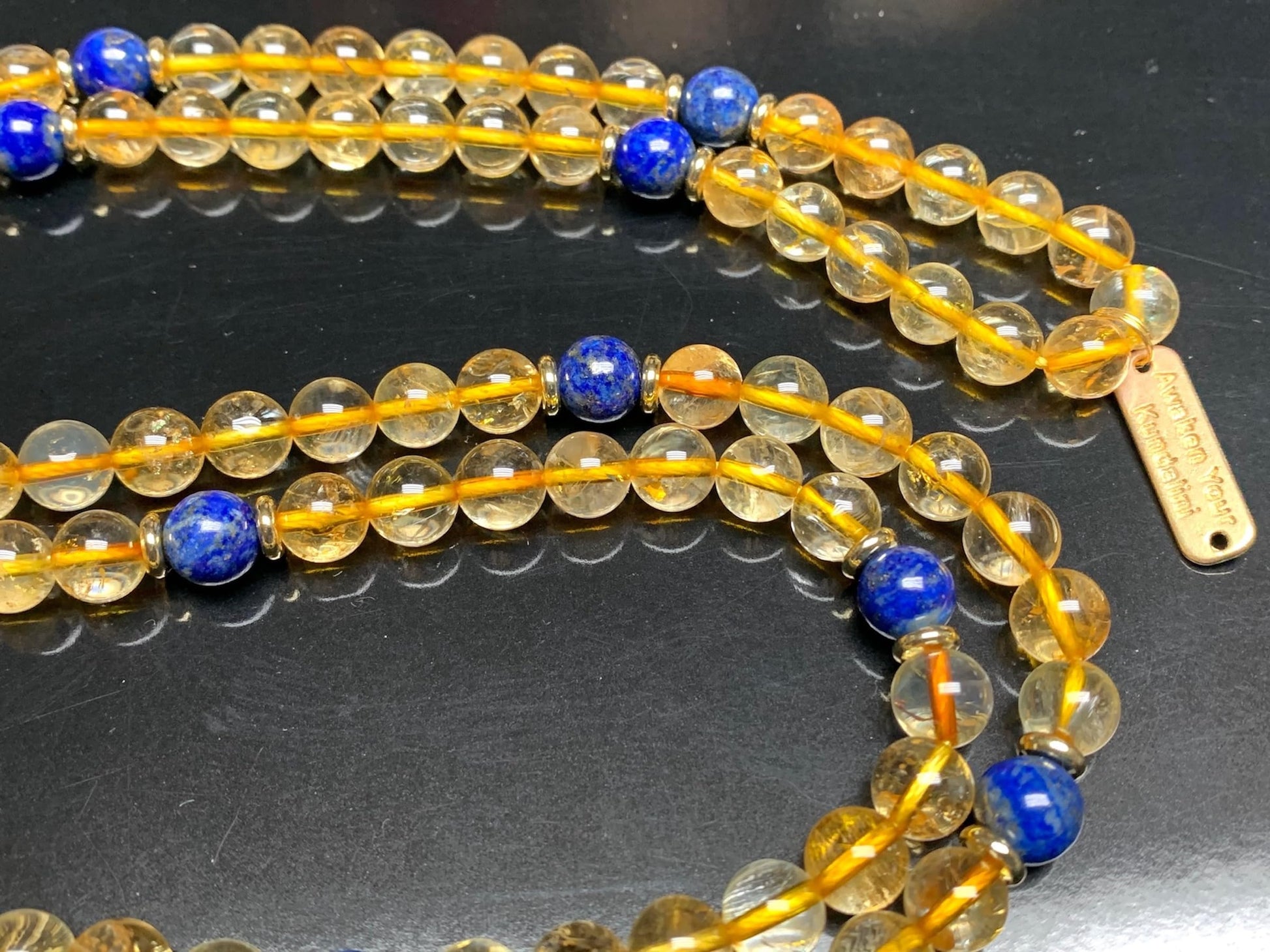 - Key Features: ✅ 108 High-Grade Beads (Citrine + Lapis Lazuli, 8mm). ✅ One-of-a-Kind Raw Lapis Lazuli Guru Bead. ✅ Subtle Gold-Tone Spacers for Elegant Transitions. ✅ 36-40" Adjustable Length (Triple-Wrap Versatility). ✅ Velvet Storage Pouch Included.