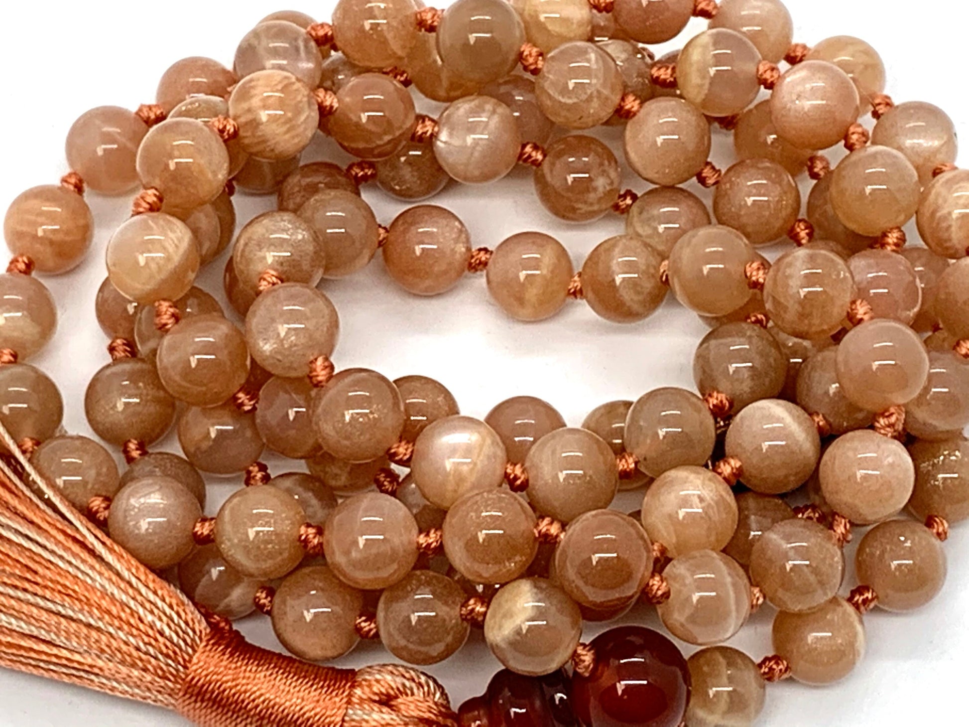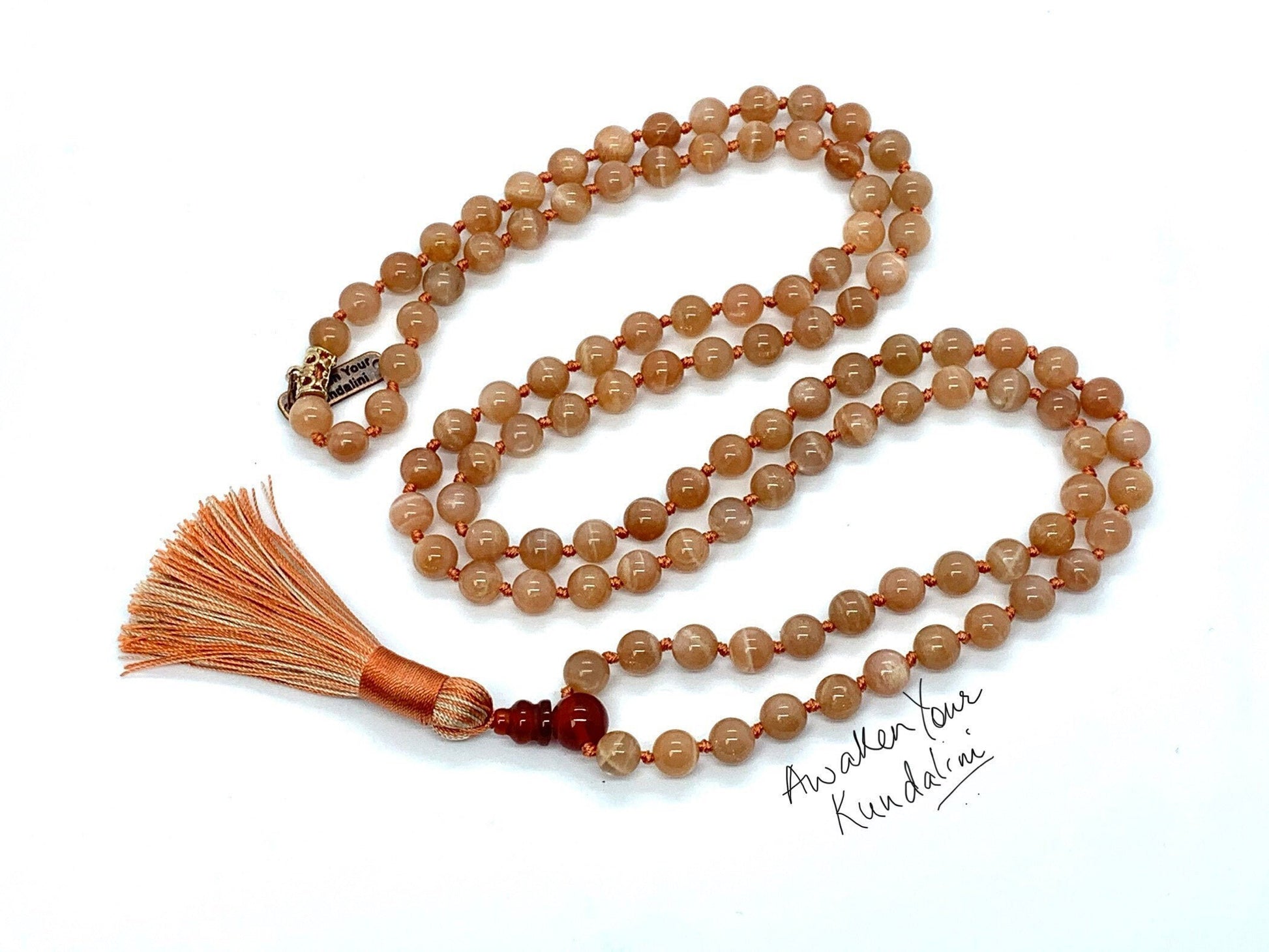 This Hand Knotted Sunstone Mala Necklace features 108 shimmering, high-grade 8mm beads strung with warm-toned silk or nylon thread. Each bead is knotted with intention to ground and uplift. The mala is finished with a raw Carnelian or Golden Quartz guru bead — both igniting deeper Sacral healing and fire element activation.