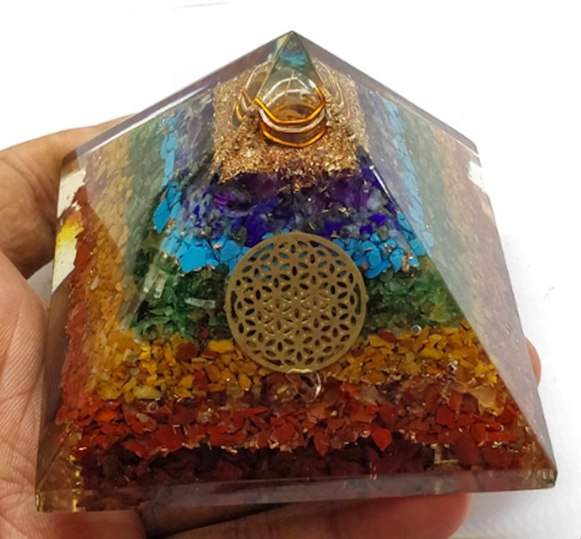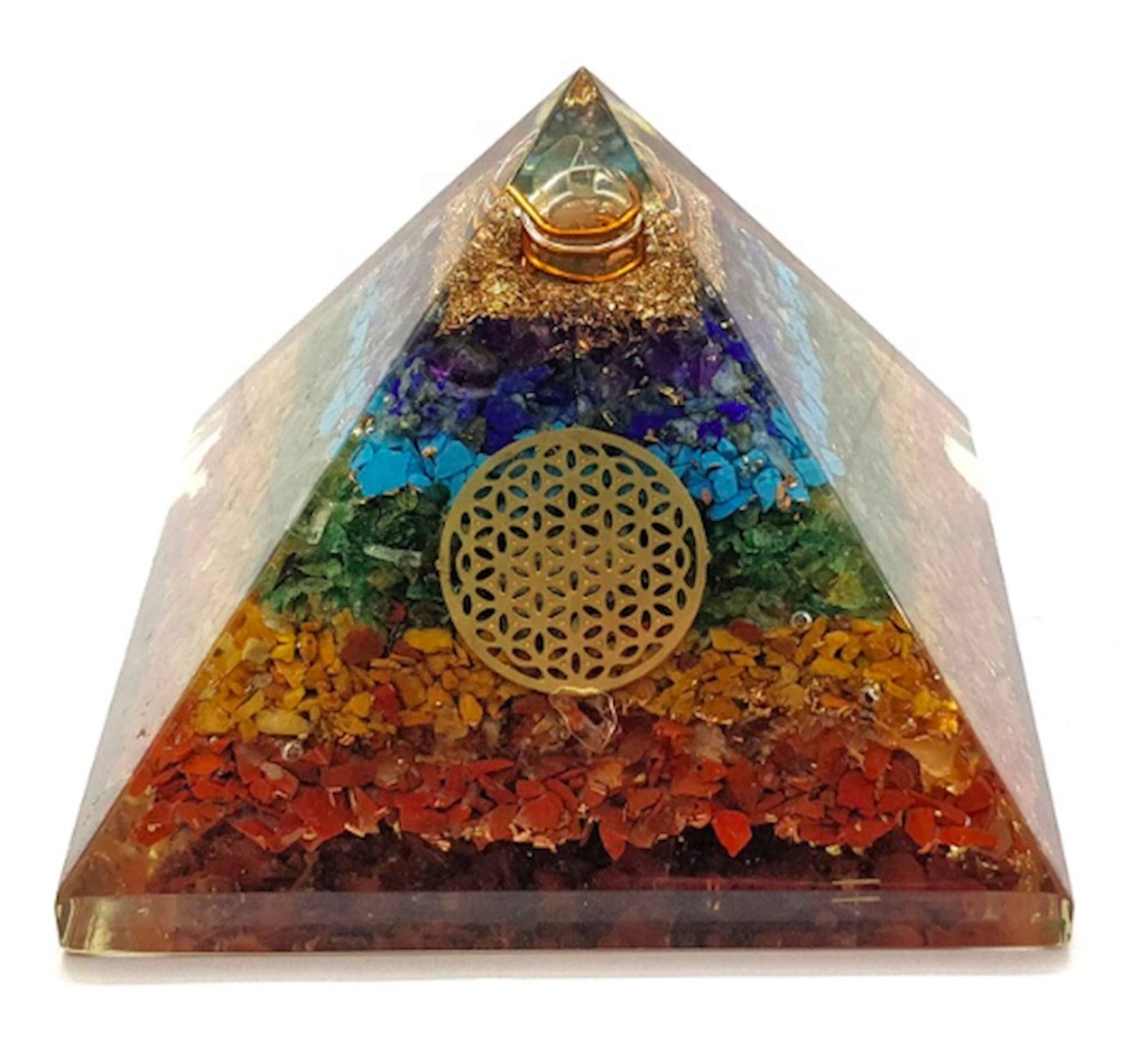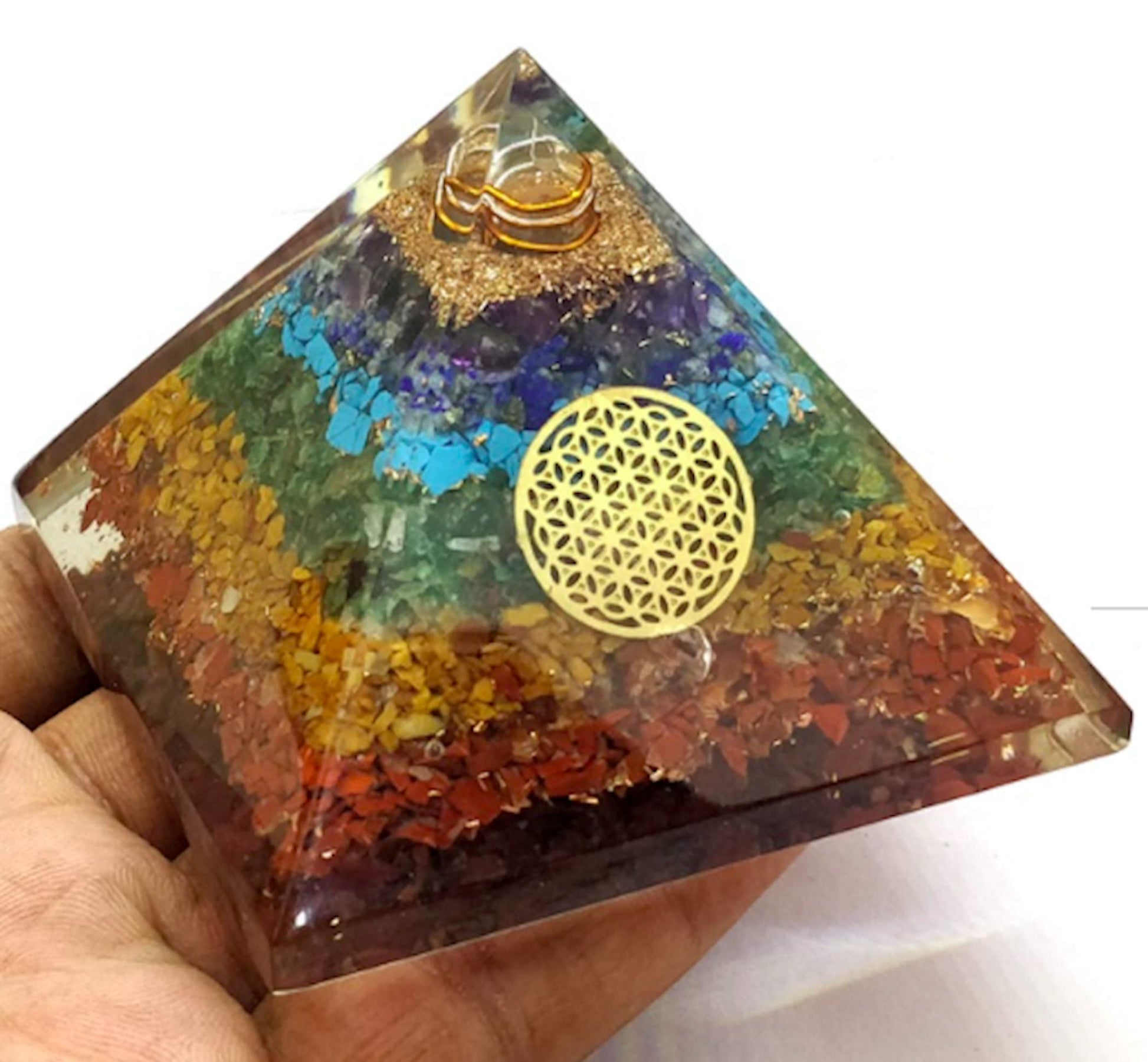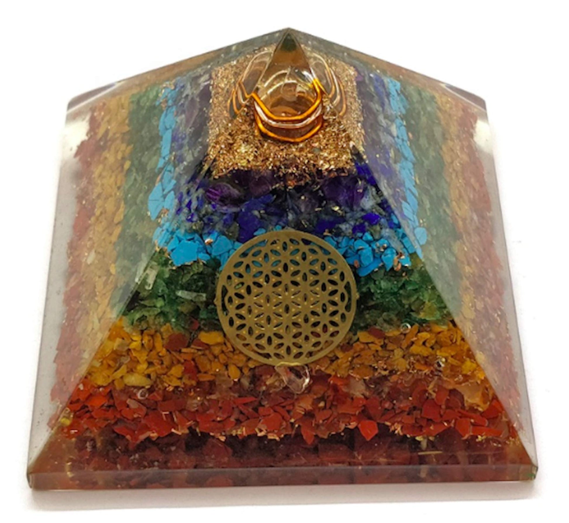 Structure: Resin-based orgonite pyramid with metal coils and chakra stones