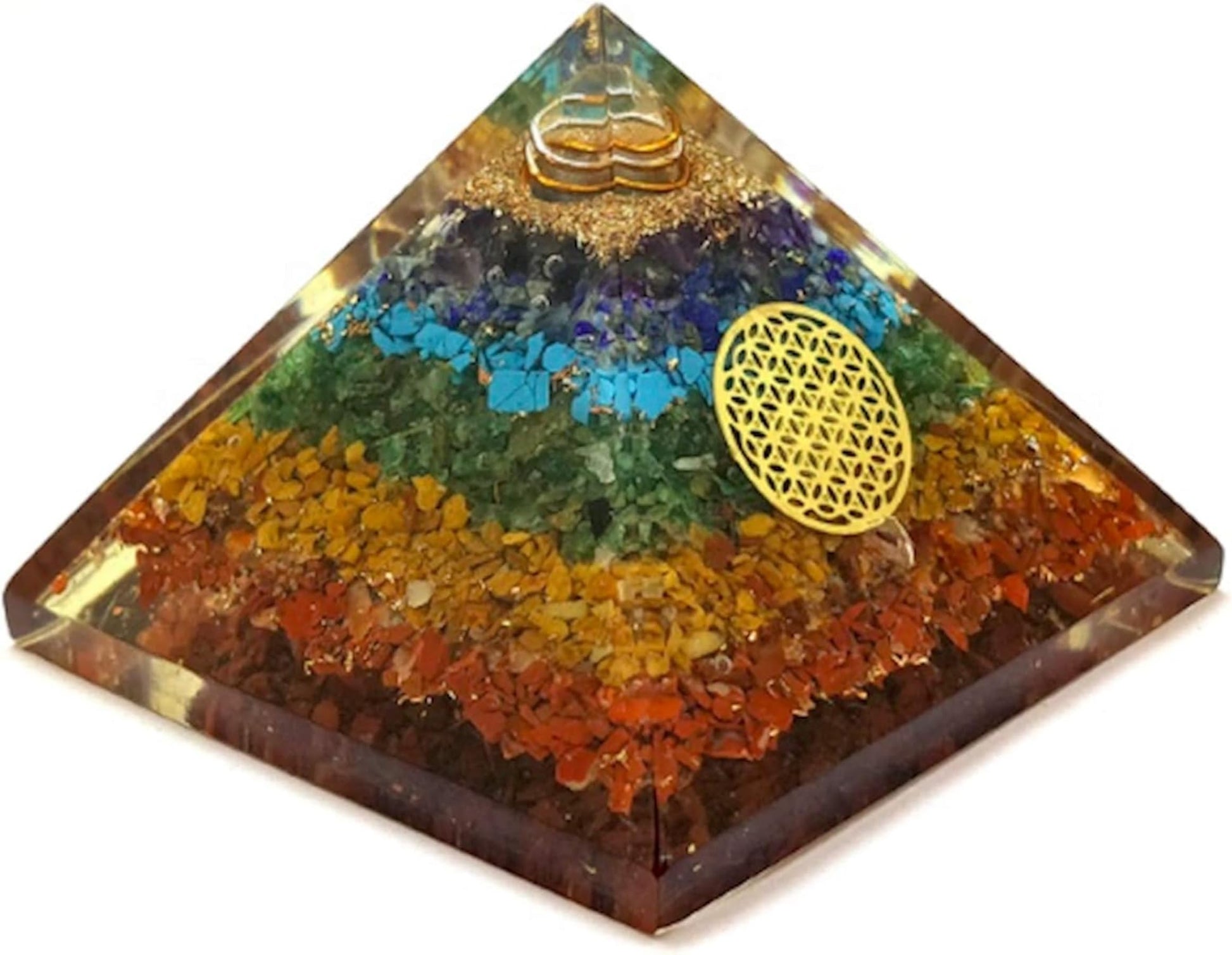 Each layer is infused with gemstone chips aligned with the seven chakras—Root to Crown—supporting full-spectrum energy alignment. The Flower of Life embedded within the pyramid radiates ancient harmony and geometric wisdom, amplifying the orgonite's subtle energy field.
