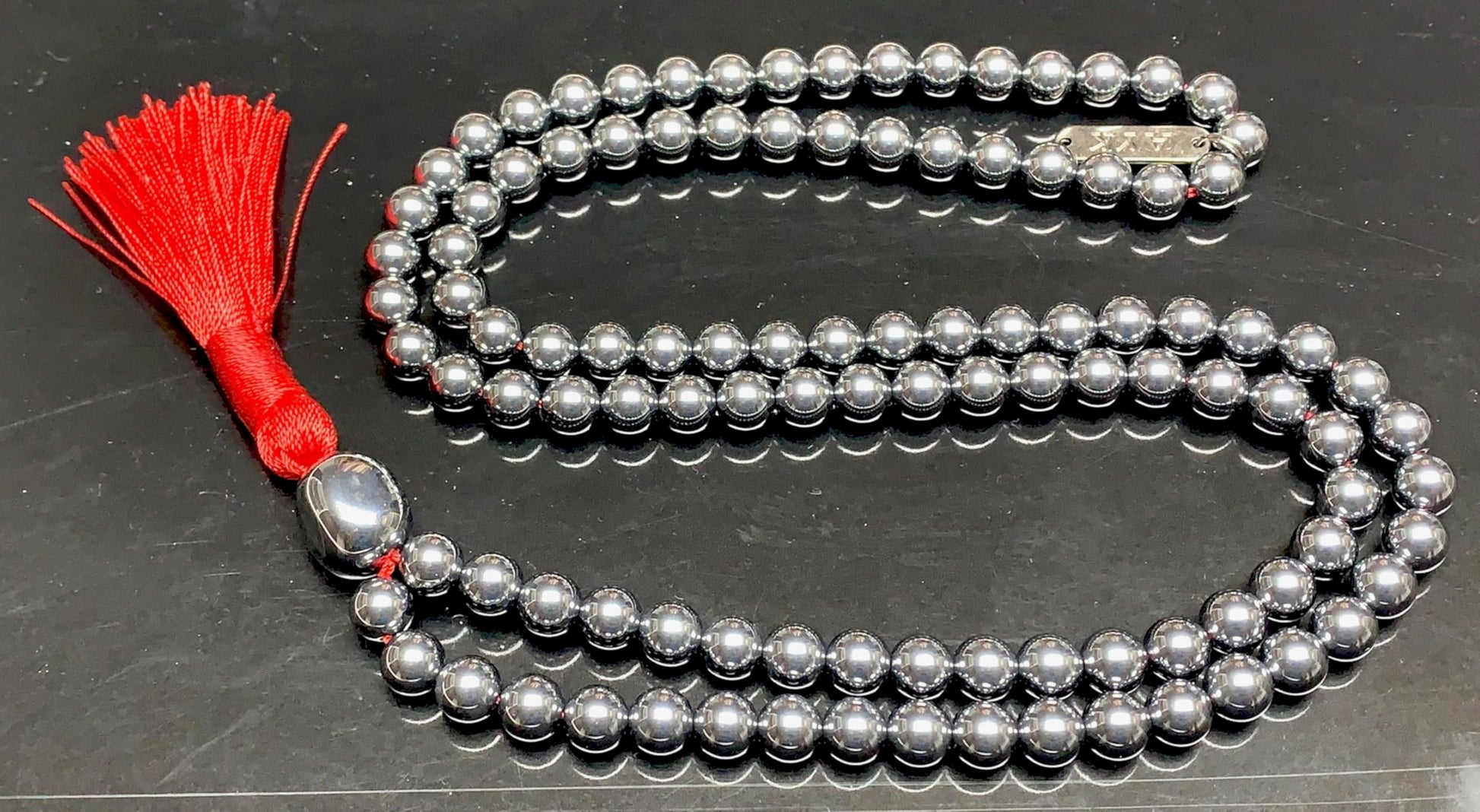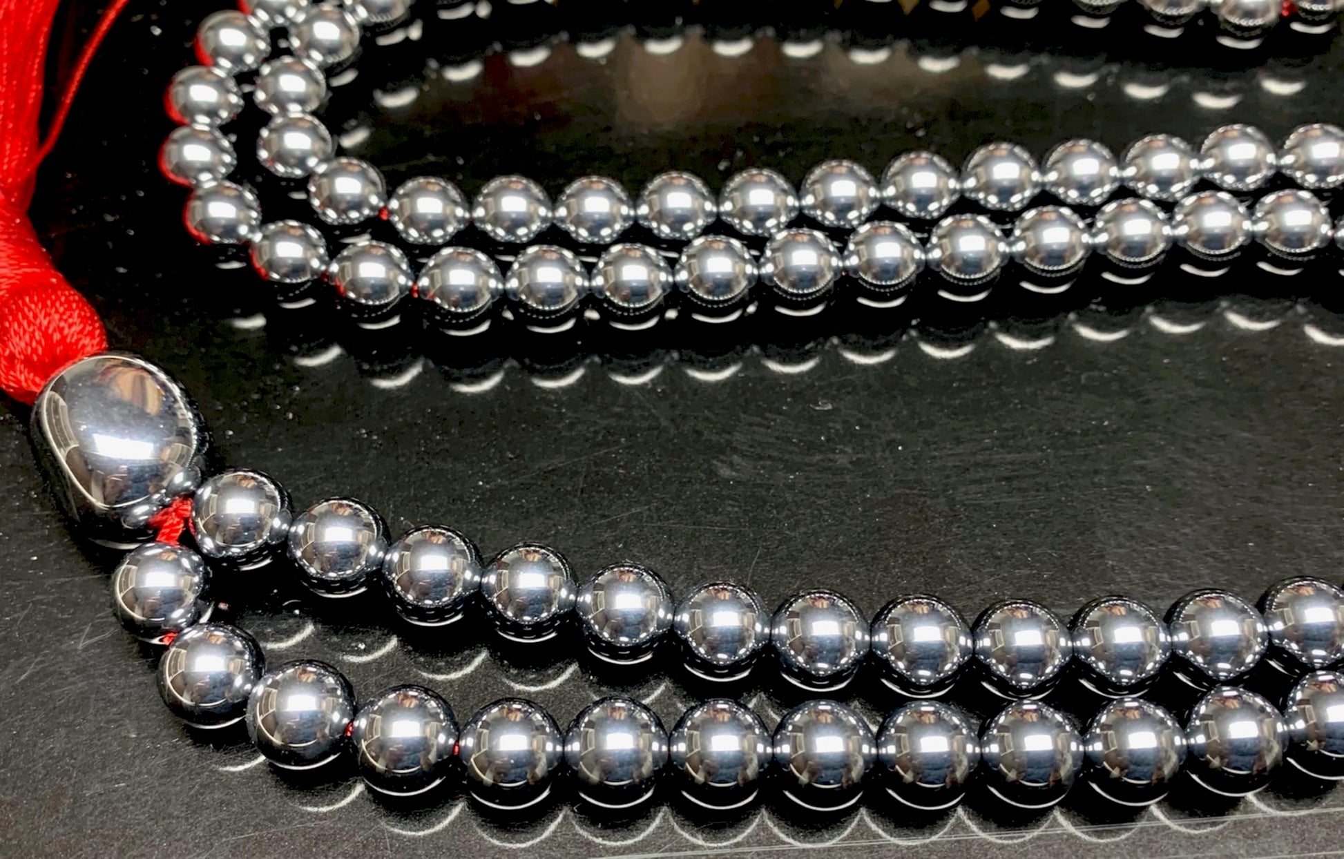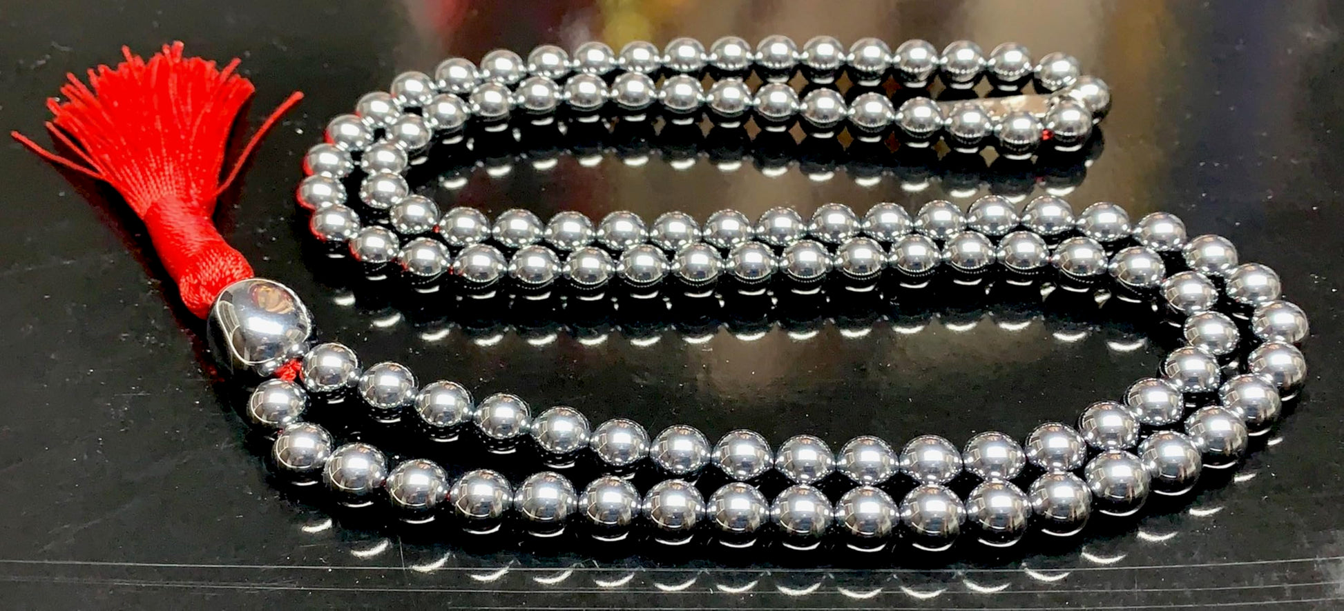 The Terahertz Protection Mala Necklace is a 108-bead hand-knotted strand designed to harmonize the body’s energetic field and support deep grounding. Each 8mm Terahertz bead is strung with care and intention using durable black nylon cord, completed with a Black Tourmaline or Hematite guru bead for enhanced protection and stability.