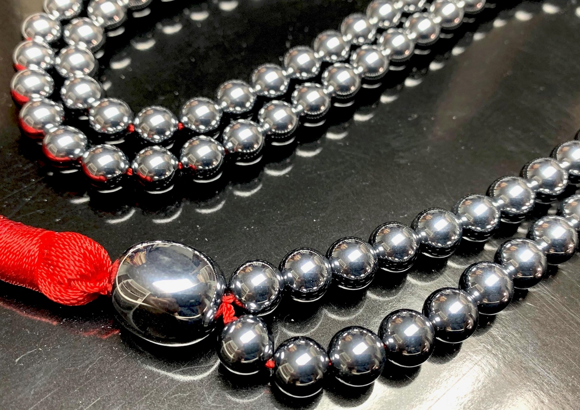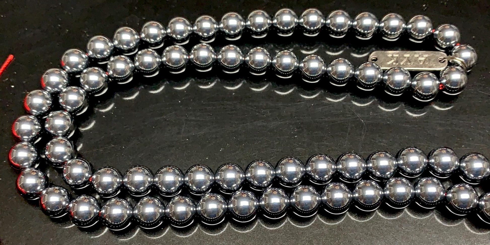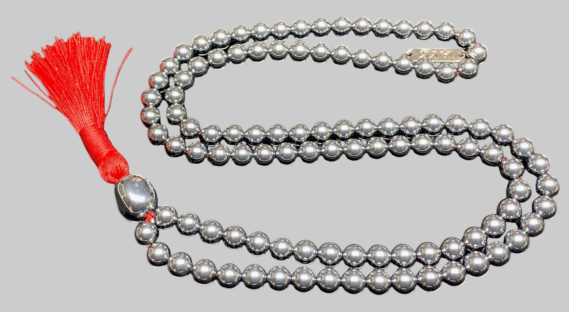 The Terahertz Protection Mala Necklace is a 108-bead hand-knotted strand designed to harmonize the body’s energetic field and support deep grounding. Each 8mm Terahertz bead is strung with care and intention using durable black nylon cord, completed with a Black Tourmaline or Hematite guru bead for enhanced protection and stability.