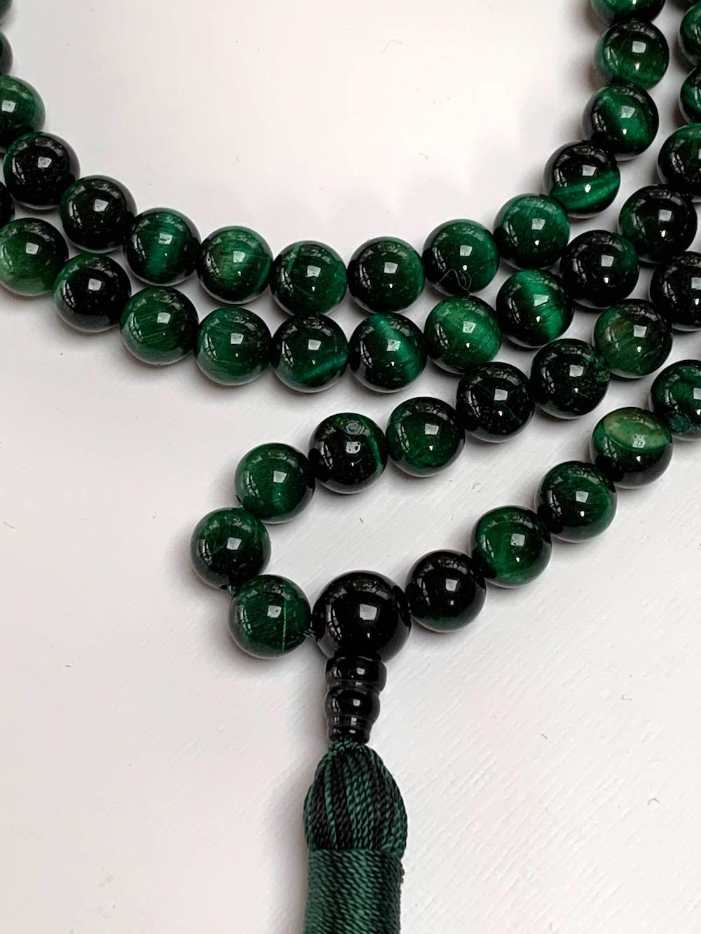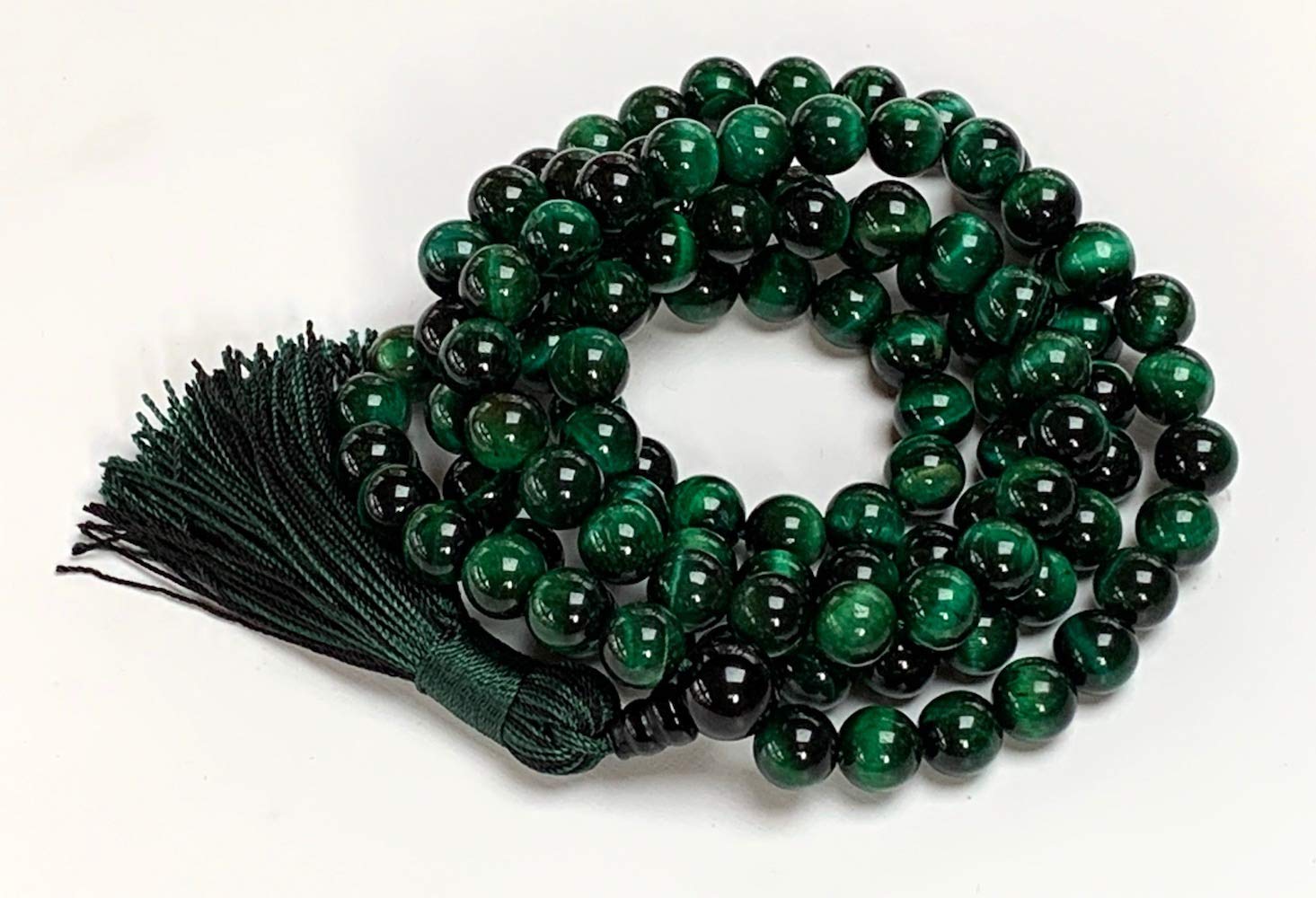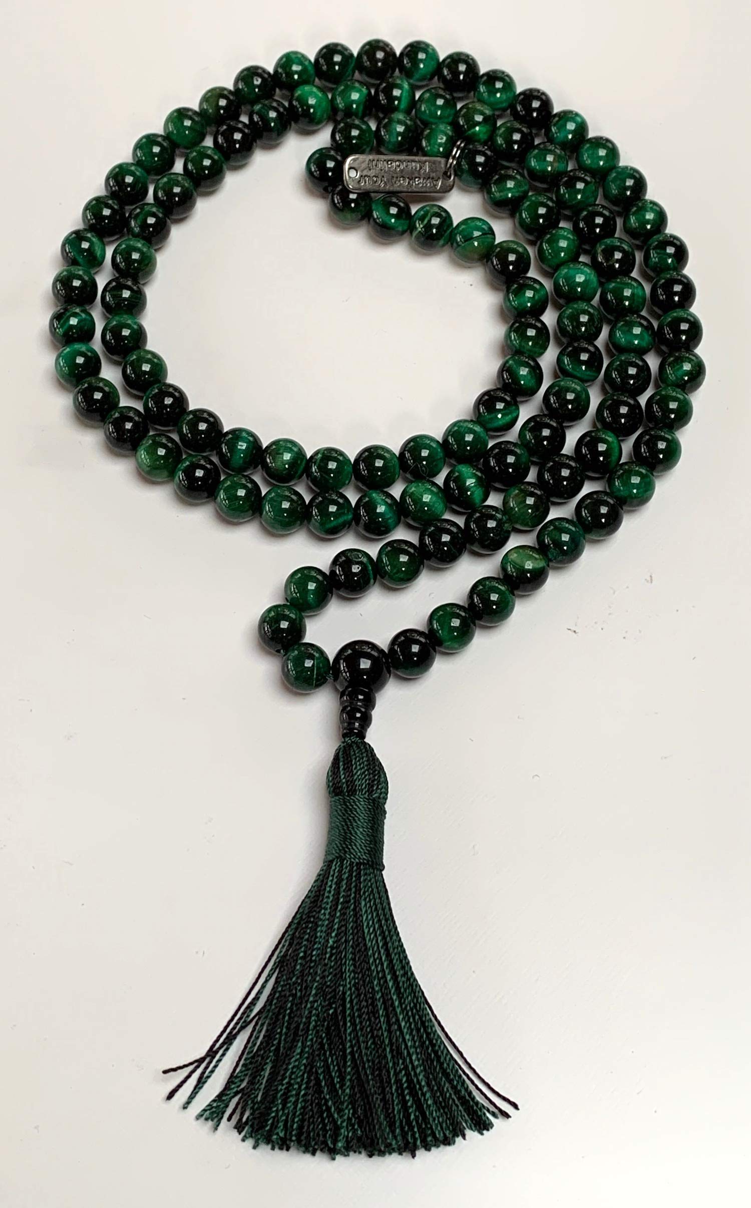 - Elevate your spiritual practice and style with our Green Tiger's Eye Mala Necklace, crafted from AAA grade 8mm beads. This exquisite mala necklace, featuring 108 beads, is perfect for meditation, mindfulness, and as a statement piece of jewelry.