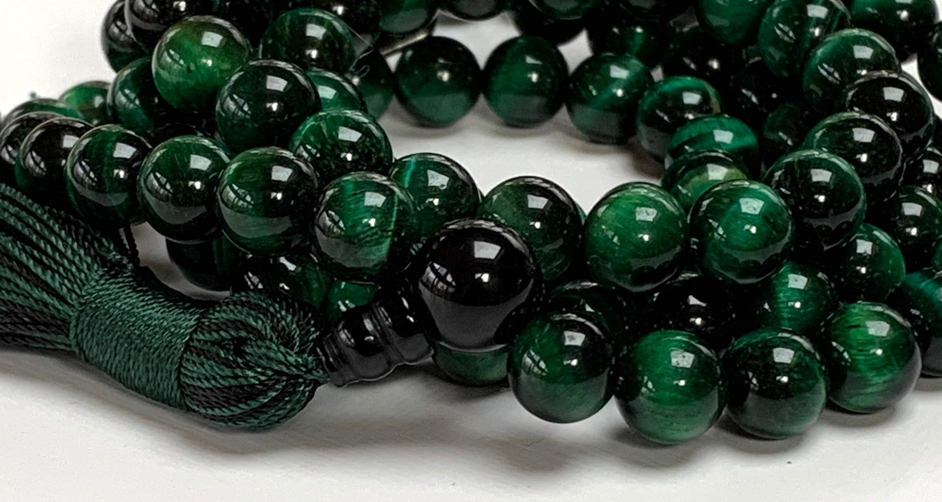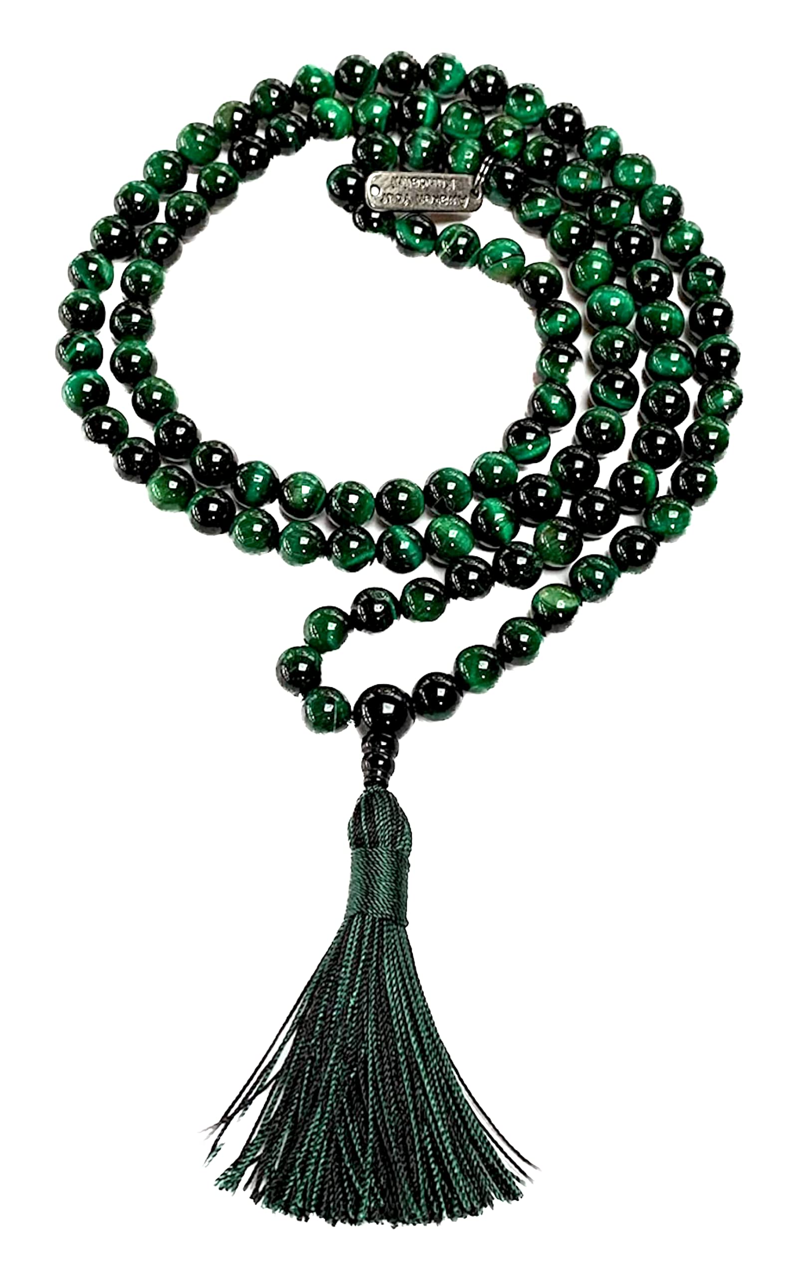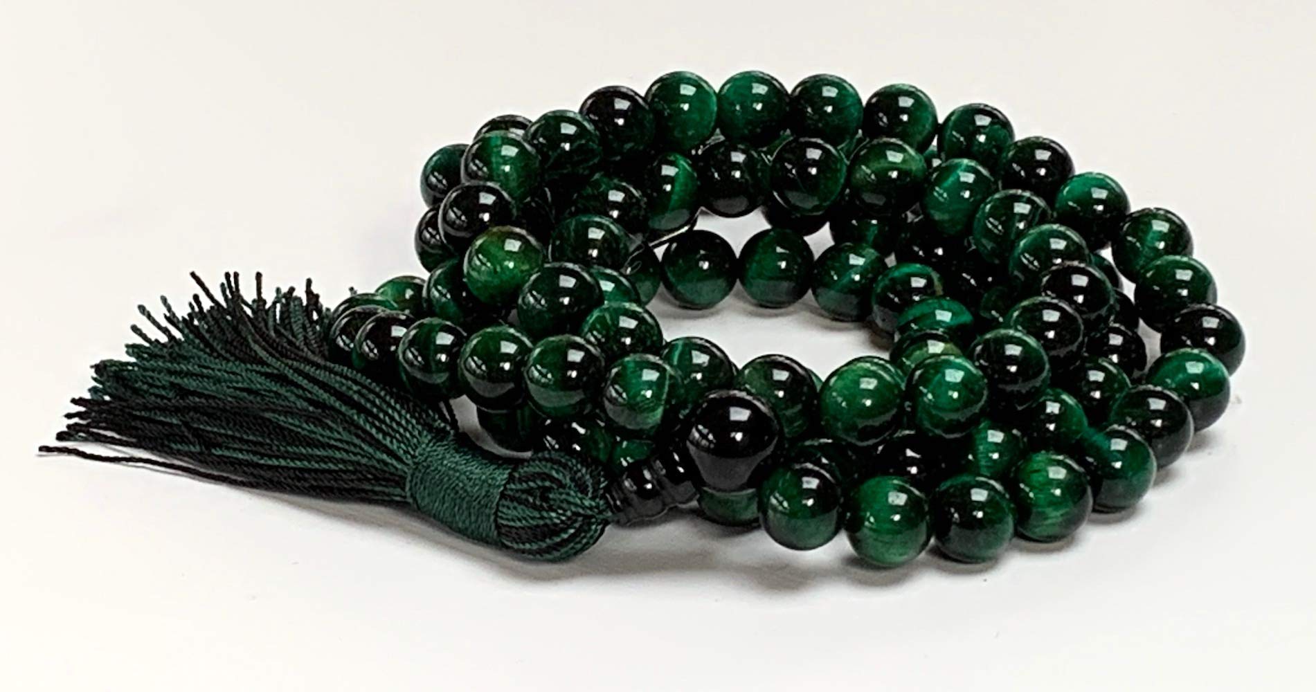 - Elevate your spiritual practice and style with our Green Tiger's Eye Mala Necklace, crafted from AAA grade 8mm beads. This exquisite mala necklace, featuring 108 beads, is perfect for meditation, mindfulness, and as a statement piece of jewelry.