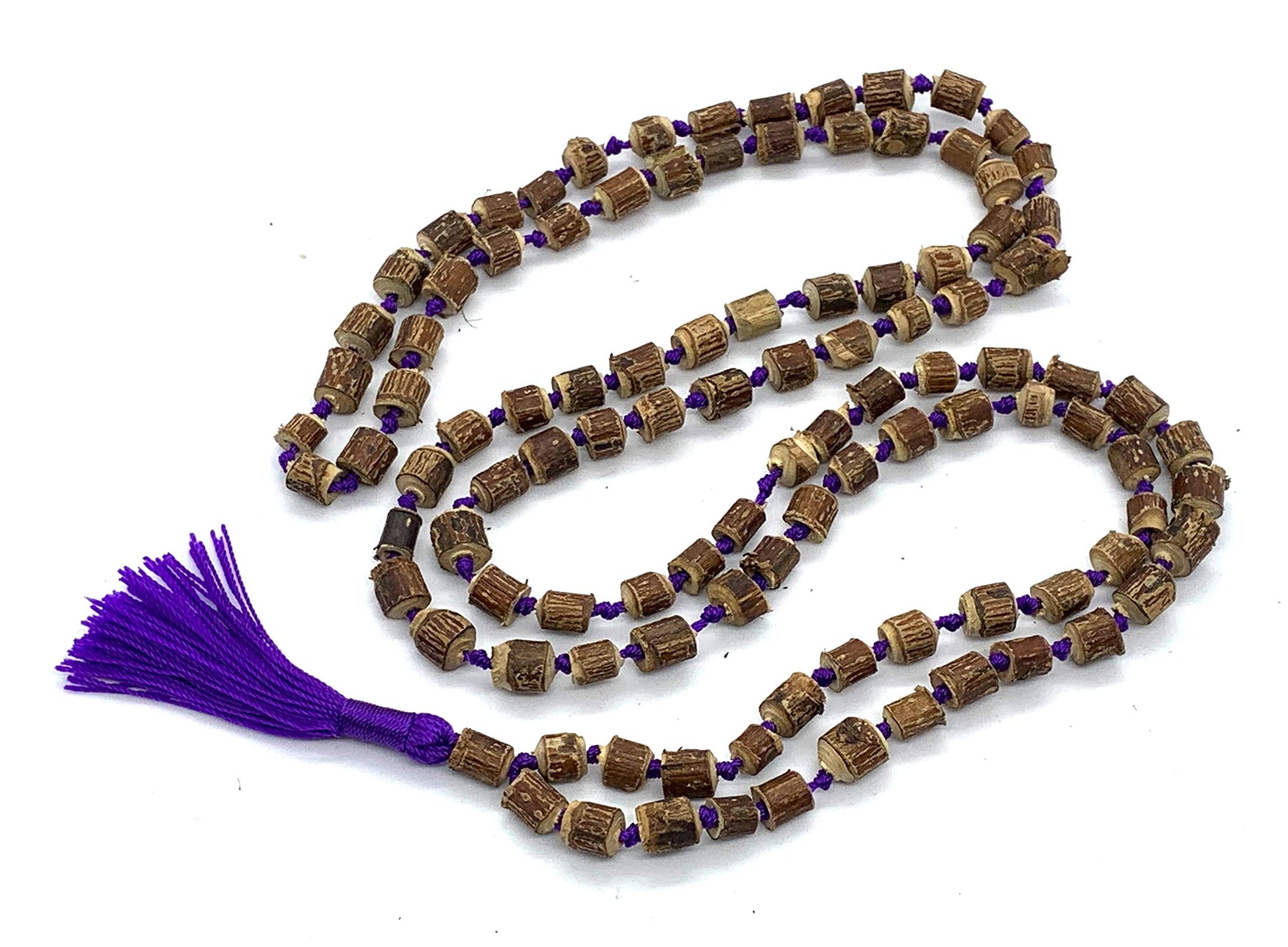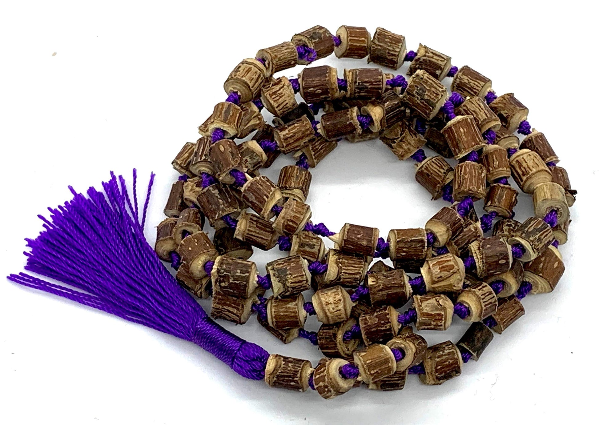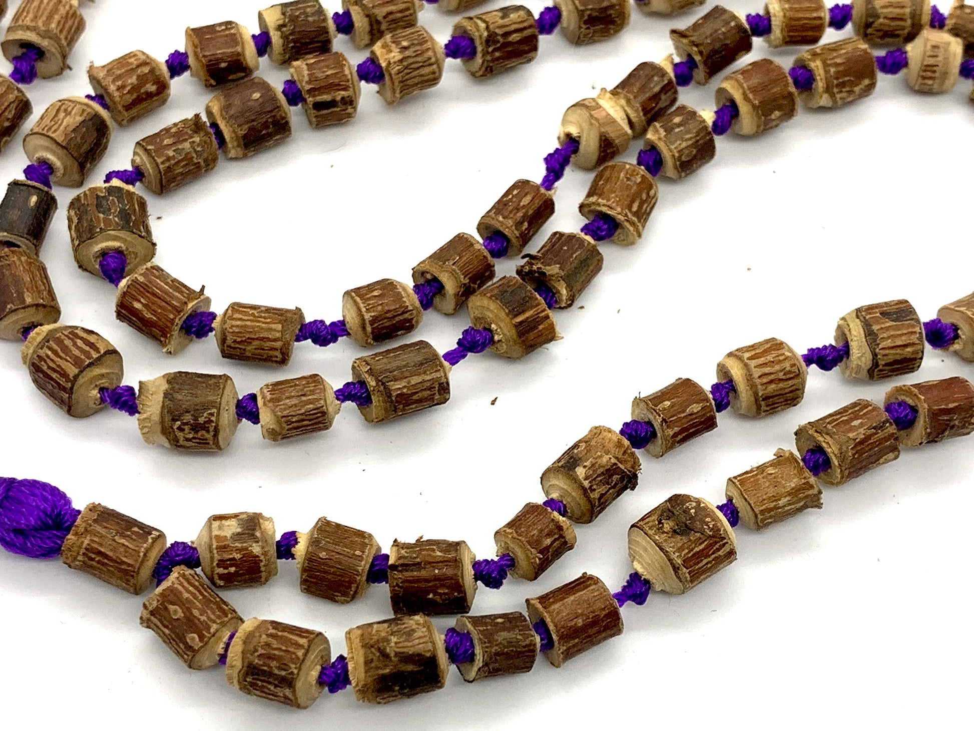 - ROUGH BEADS WITH SPLINTERS SO HANDLE WITH CARE. Tulsi (Holy Basil) is considered the most sacred of the woods used in Indian worship and the Tulsi plant is believed to be an incarnation of the Divine. THIS MALA IS VERY DIFFICULT TO MAKE AS THE BEADS ARE ROUGH AND RAW CUT. TAKES NEARLY 4-5 HOURS. Tulsi is reported to possess remarkable physical and spiritual healing properties and helps to improve devotion and love in the heart.