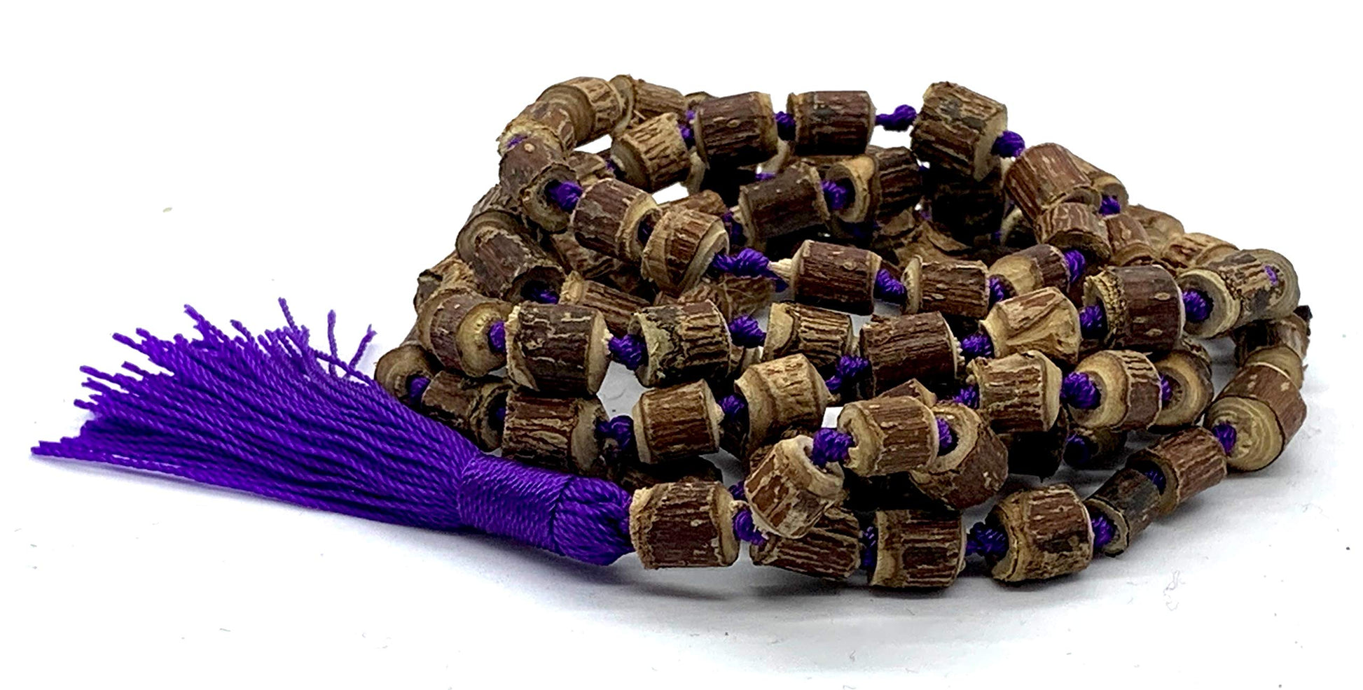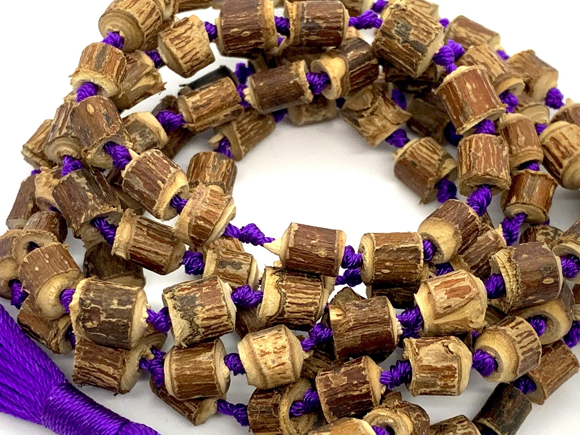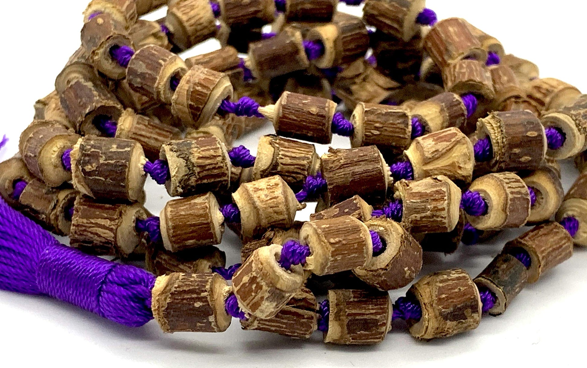 - ROUGH BEADS WITH SPLINTERS SO HANDLE WITH CARE. Tulsi (Holy Basil) is considered the most sacred of the woods used in Indian worship and the Tulsi plant is believed to be an incarnation of the Divine. THIS MALA IS VERY DIFFICULT TO MAKE AS THE BEADS ARE ROUGH AND RAW CUT. TAKES NEARLY 4-5 HOURS. Tulsi is reported to possess remarkable physical and spiritual healing properties and helps to improve devotion and love in the heart.