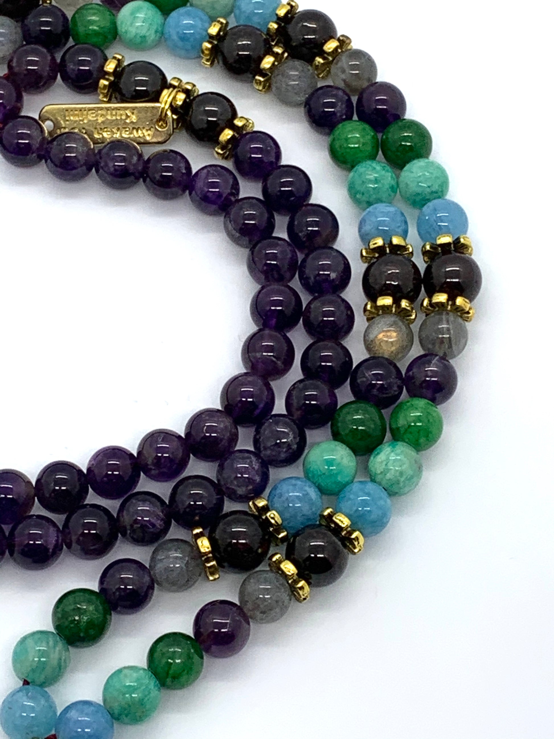 Hand-knotted with 108 sacred beads, this mala blends elegance with intention. Crafted from a constellation of Lapis Lazuli, Turquoise, Amethyst, Garnet, Aquamarine, Amazonite, and Labradorite, it harmonizes Aquarius’s expansive mind with grounding strength, making it both a spiritual tool and a luxury heirloom.