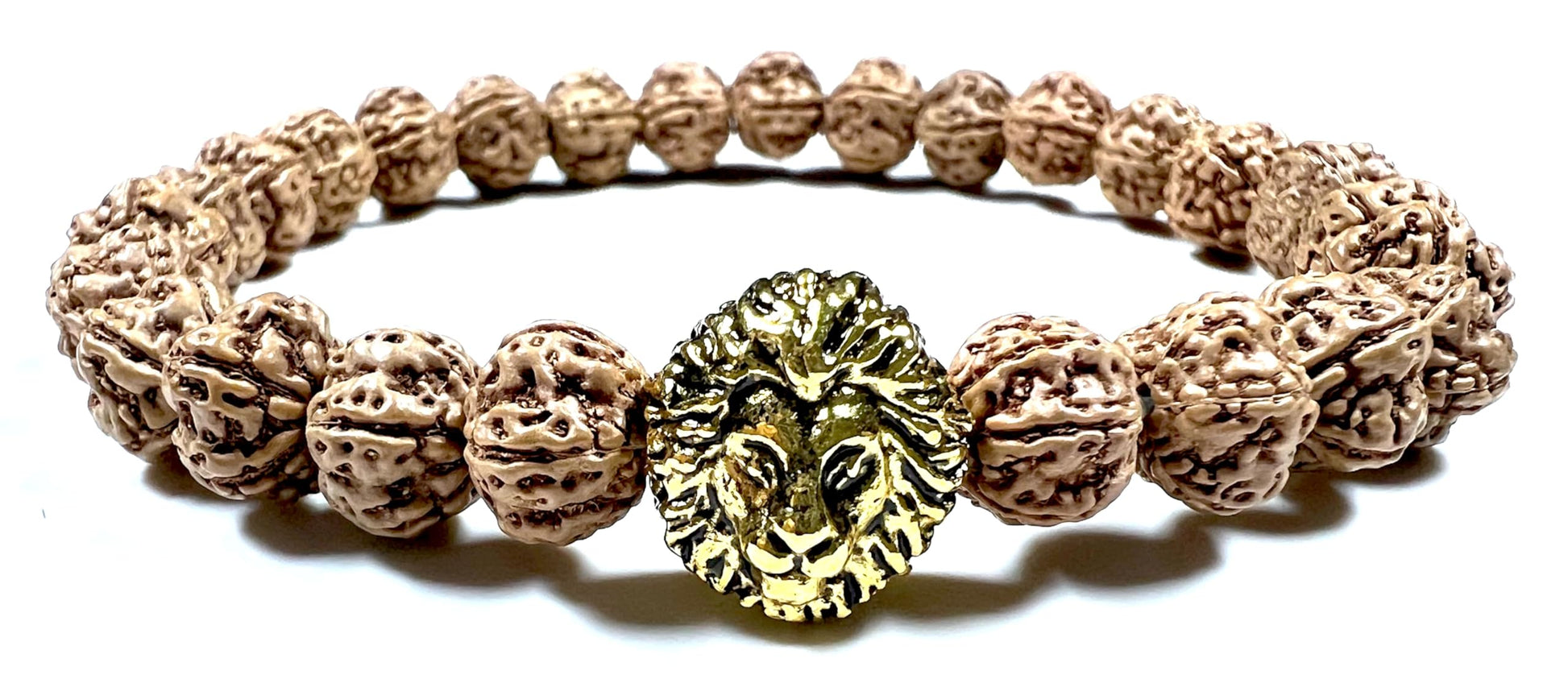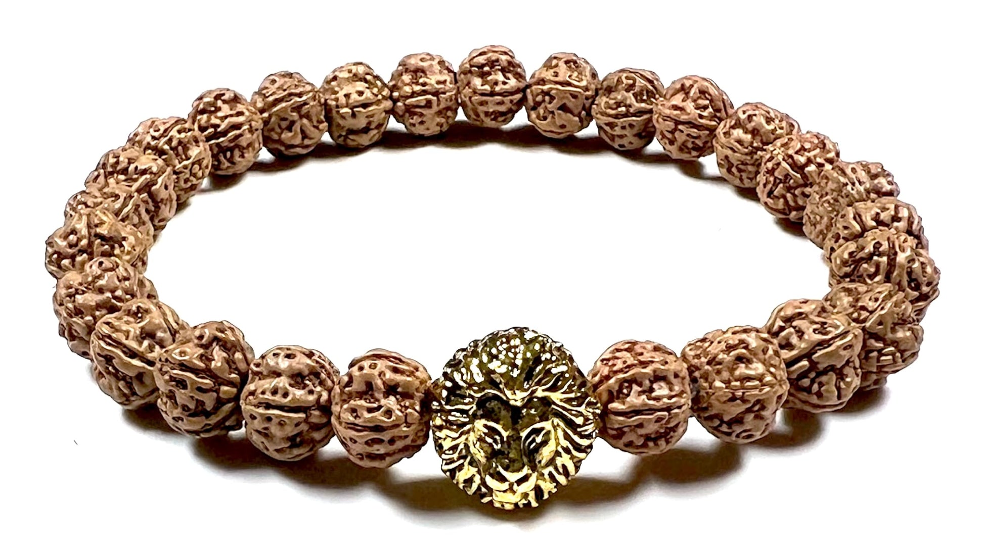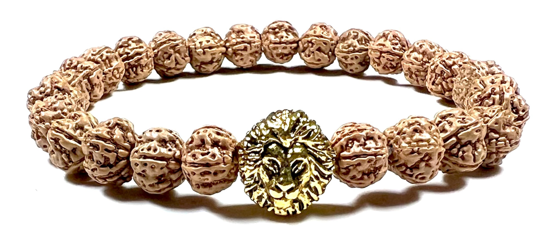 - Embrace Power & Cultivate Stability Channel your inner strength and cultivate a sense of stability with this powerful, handmade stretch bracelet. Featuring genuine 8mm 5 Mukhi Rudraksha beads and a striking golden polished lion head charm, this bracelet offers a stylish and meaningful way to promote Root Chakra balance and spiritual well-being (approximately 7.5 inches wrist size)
