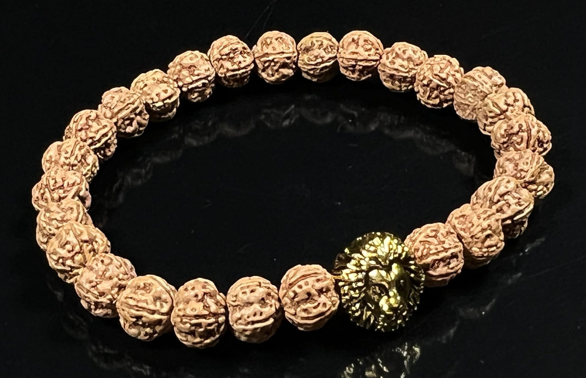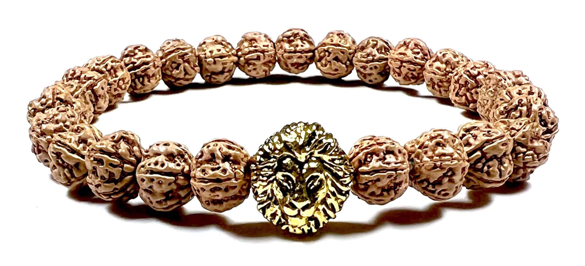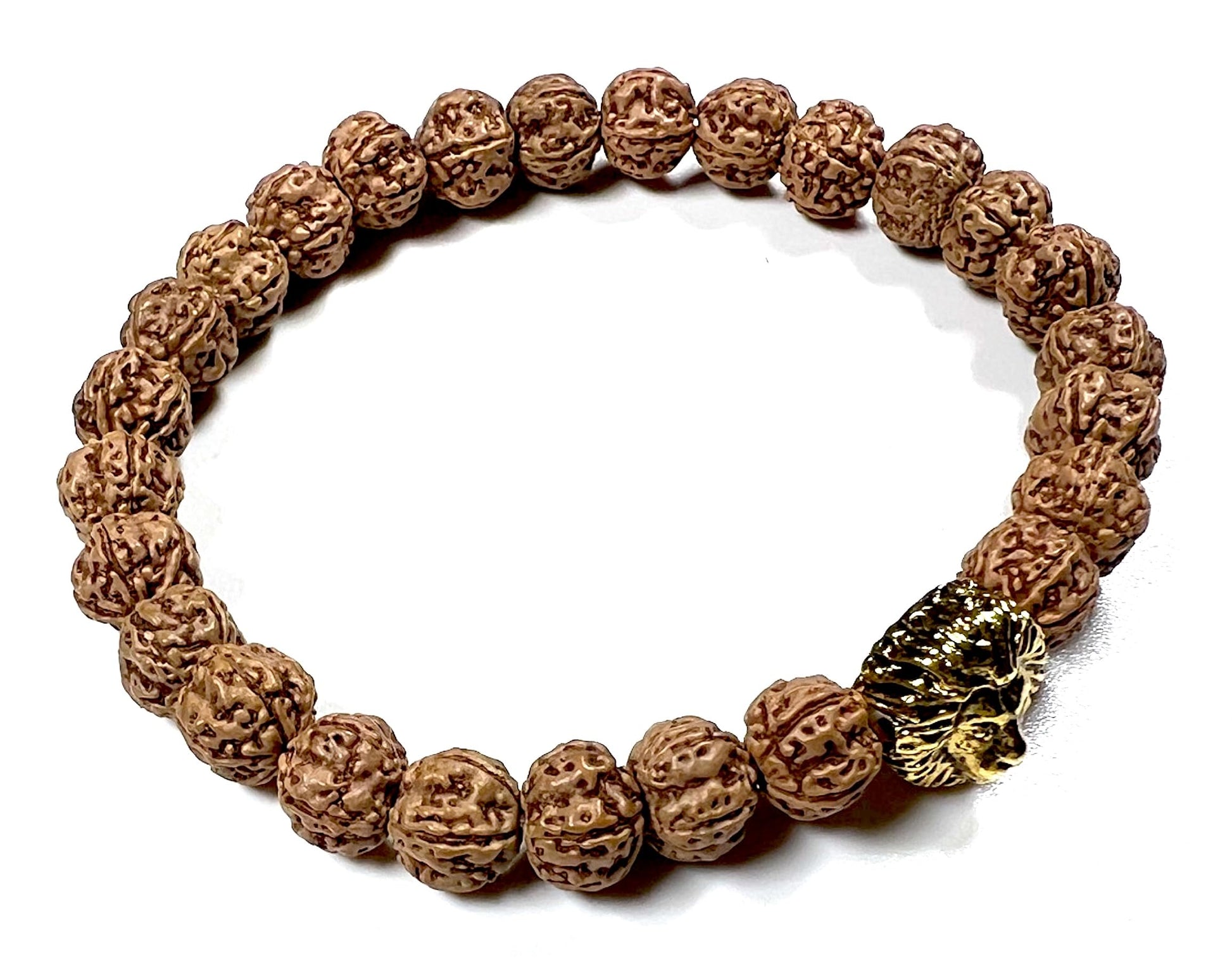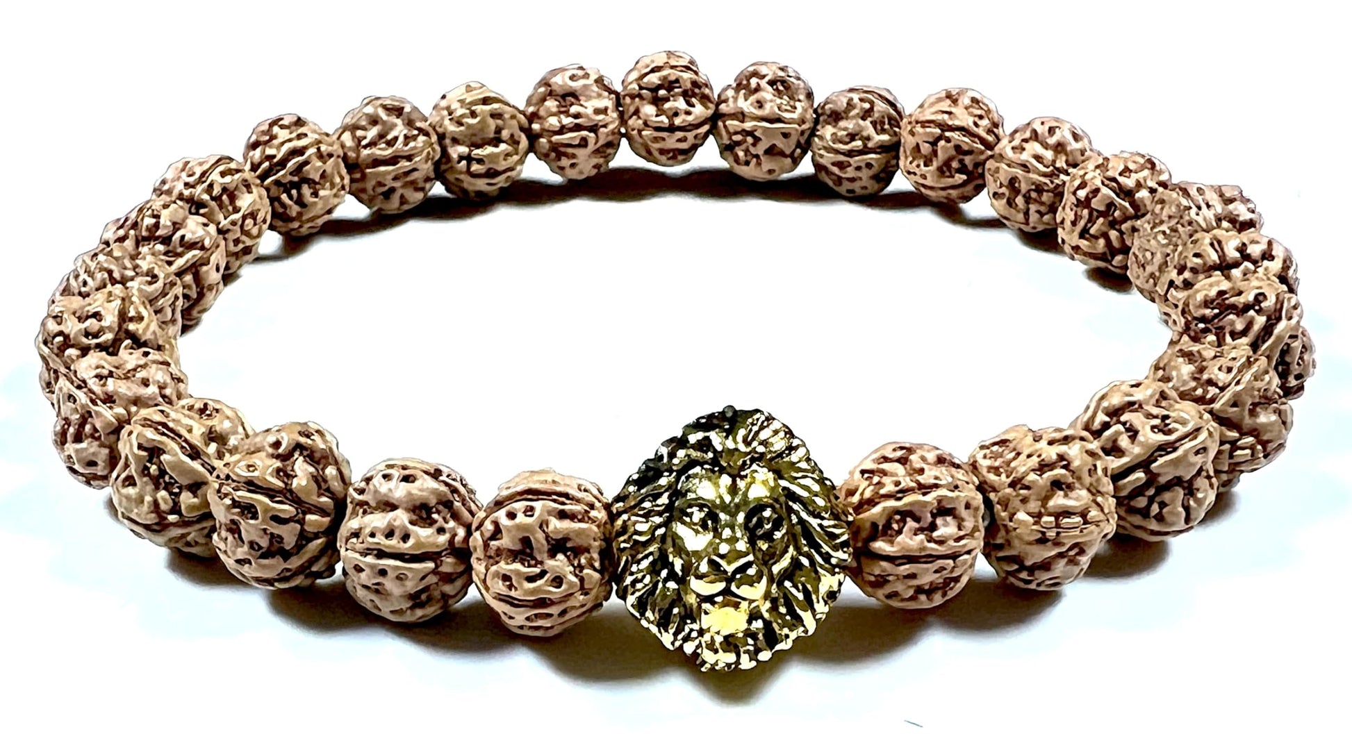 - Embrace Power & Cultivate Stability Channel your inner strength and cultivate a sense of stability with this powerful, handmade stretch bracelet. Featuring genuine 8mm 5 Mukhi Rudraksha beads and a striking golden polished lion head charm, this bracelet offers a stylish and meaningful way to promote Root Chakra balance and spiritual well-being (approximately 7.5 inches wrist size)