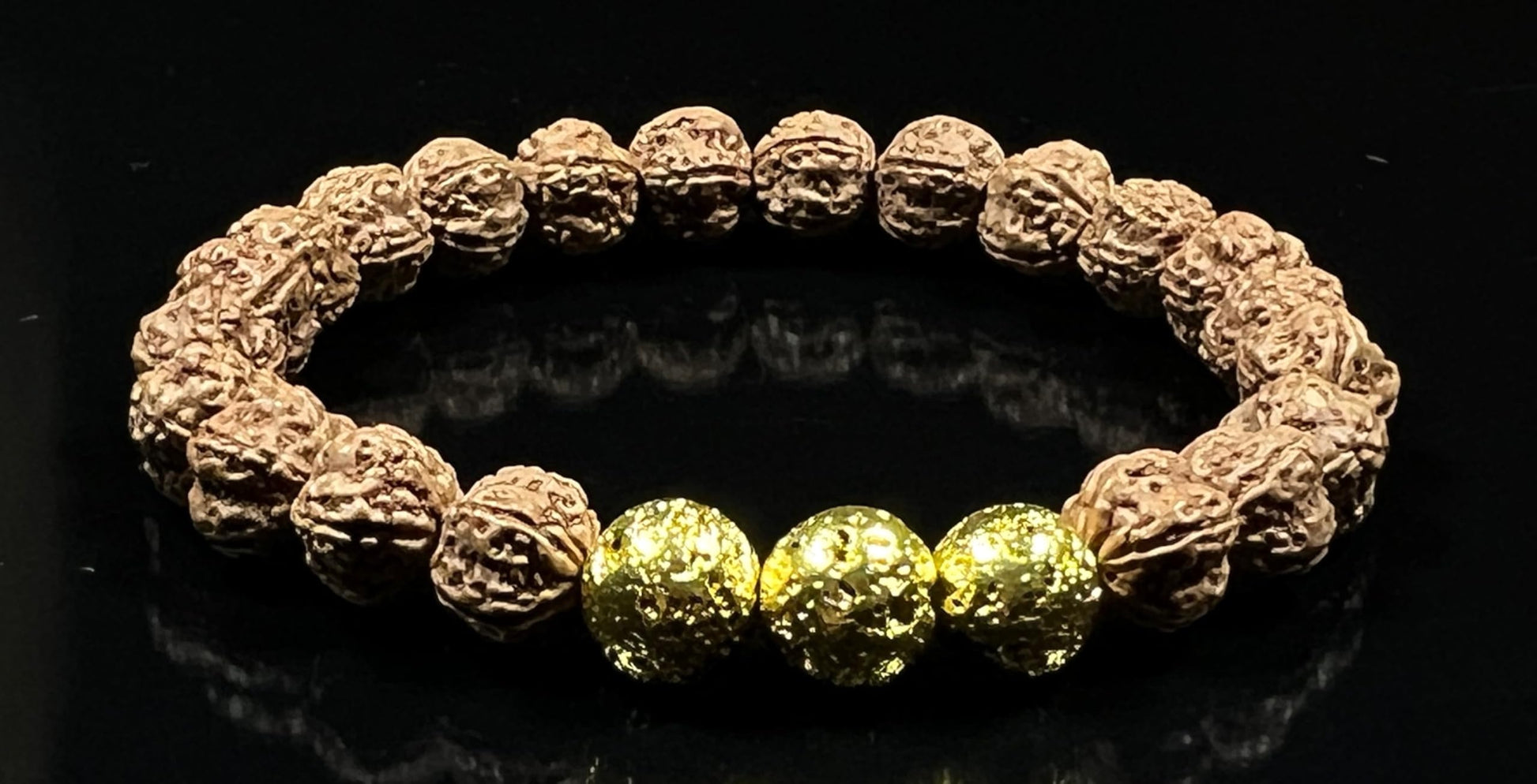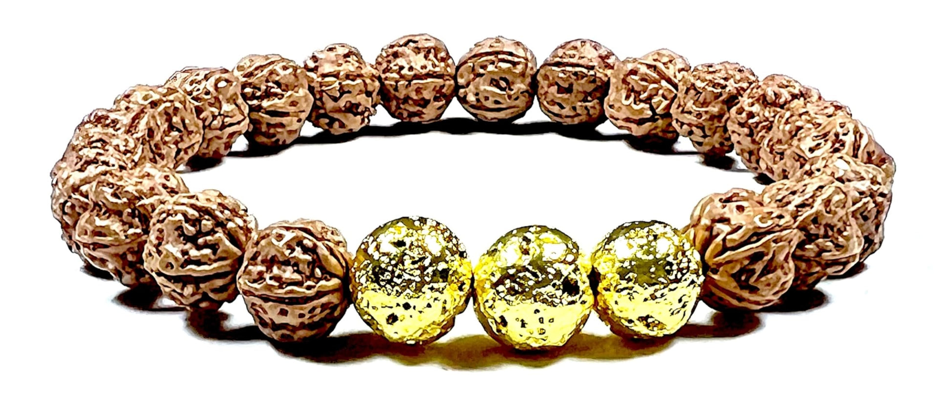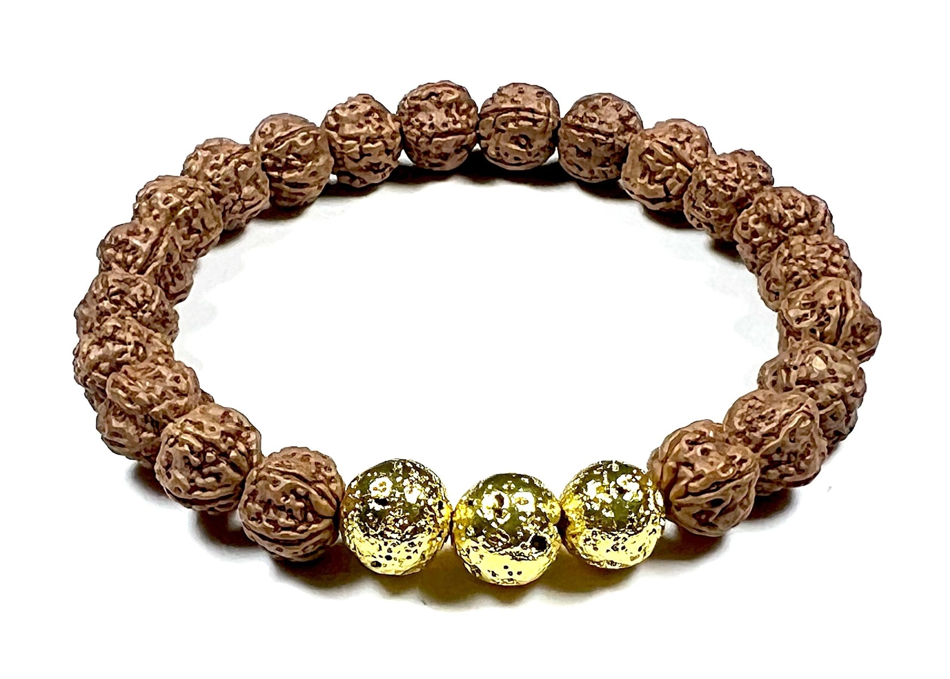 The VULCAN Rudraksha & Gold-Plated Lava Bracelet brings together sacred tradition and radiant energy. Crafted with natural Rudraksha beads and gold-plated lava rock, this 8mm stretch bracelet blends ancient wisdom with modern elegance.