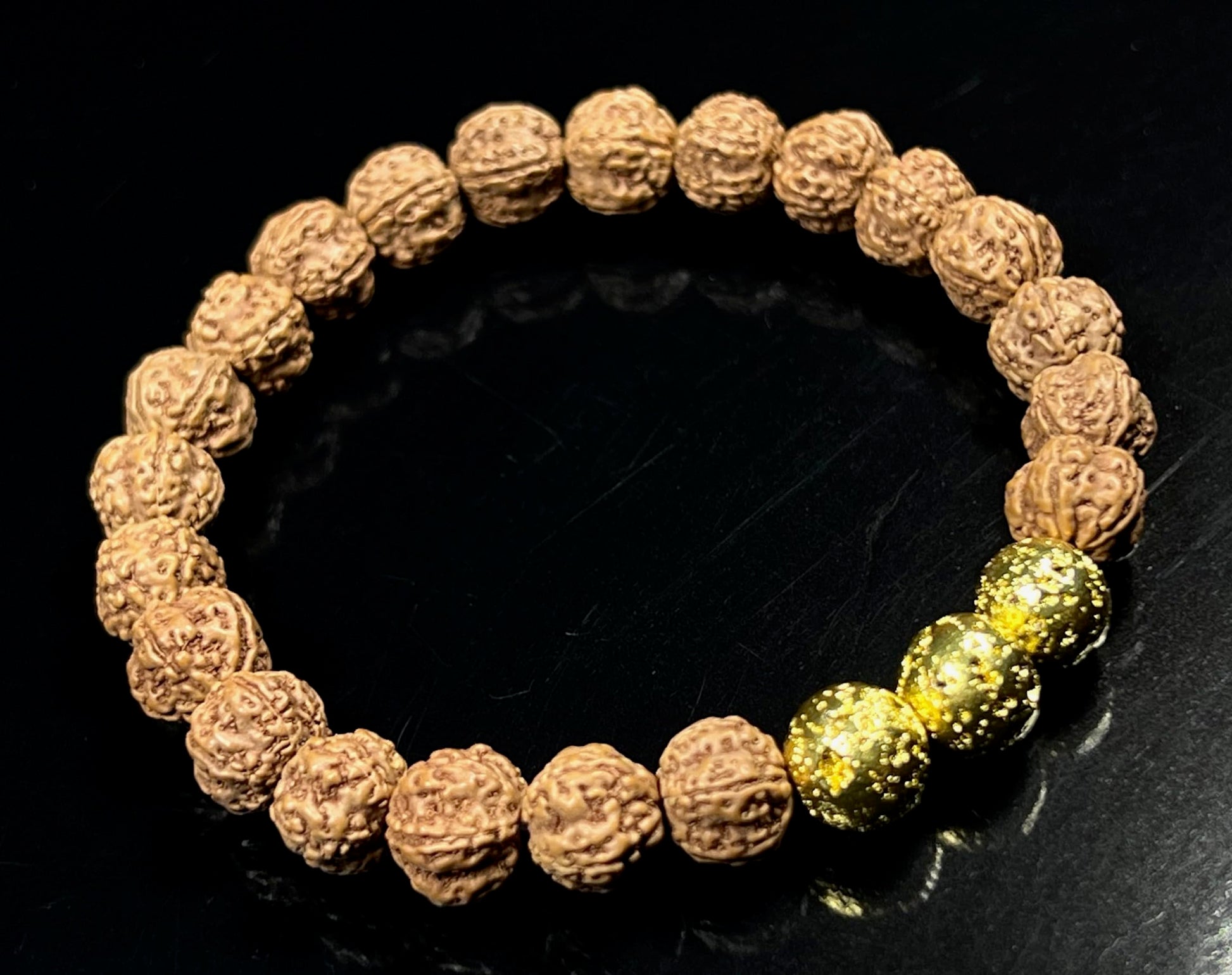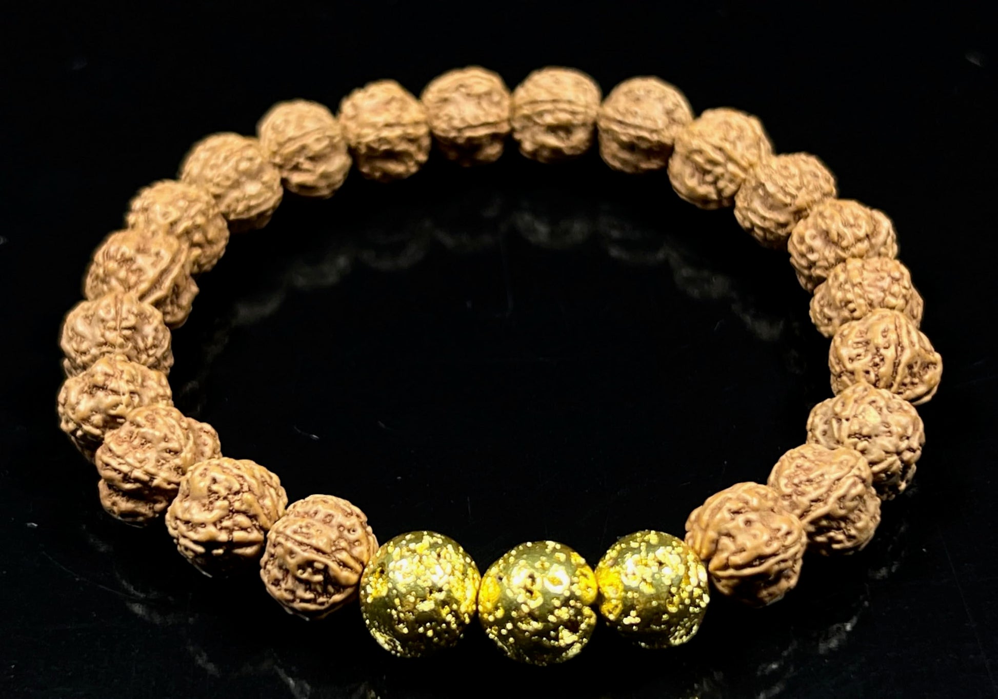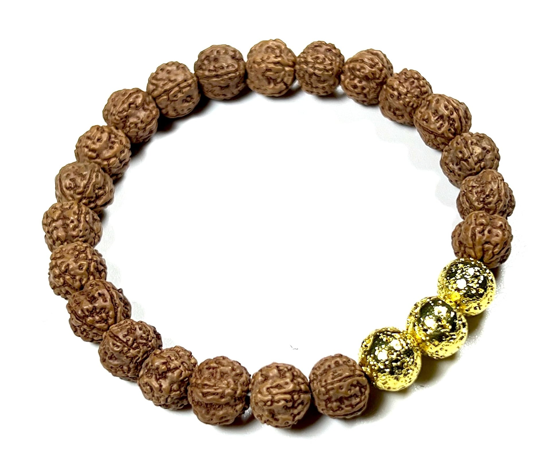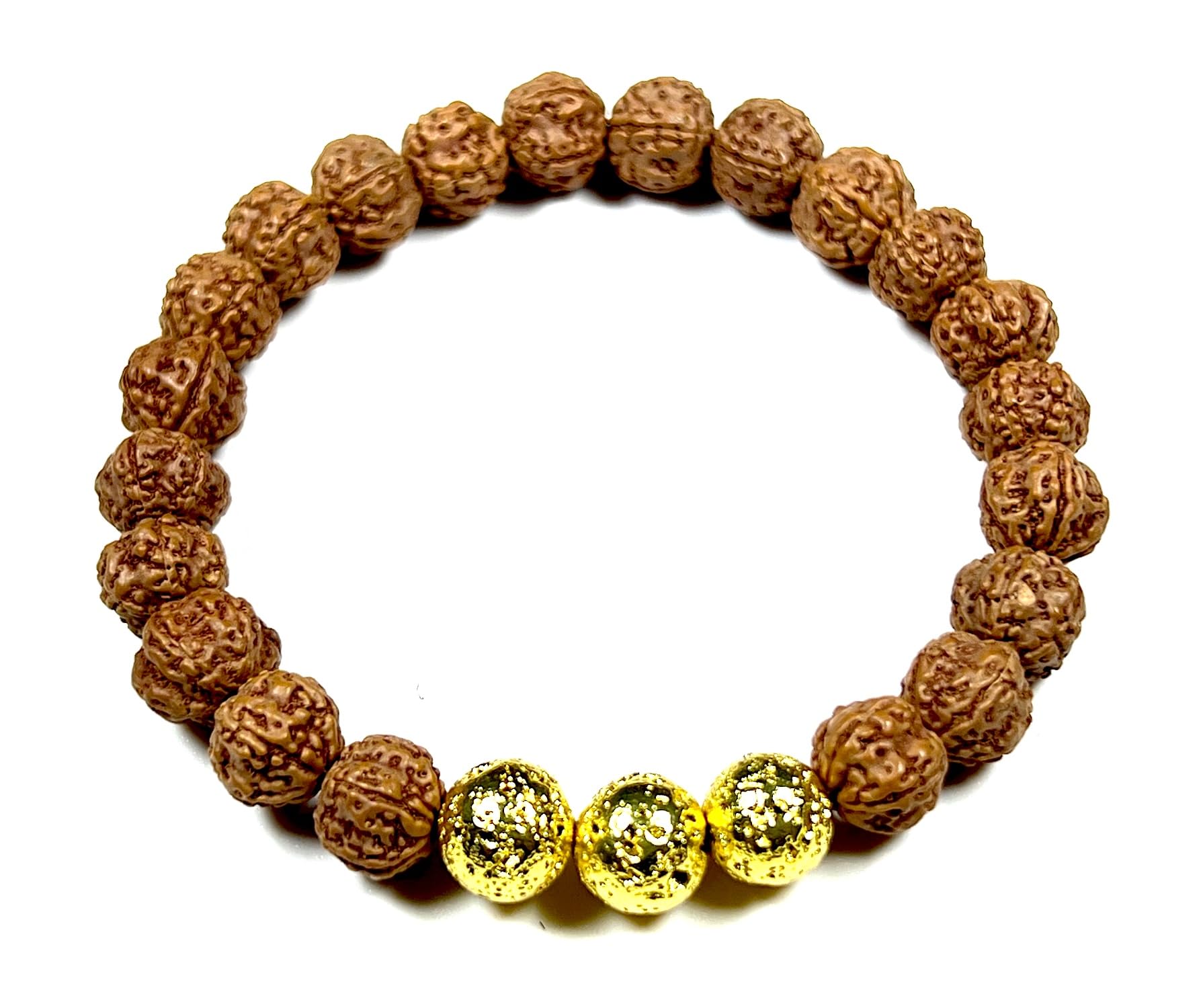 The VULCAN Rudraksha & Gold-Plated Lava Bracelet brings together sacred tradition and radiant energy. Crafted with natural Rudraksha beads and gold-plated lava rock, this 8mm stretch bracelet blends ancient wisdom with modern elegance.