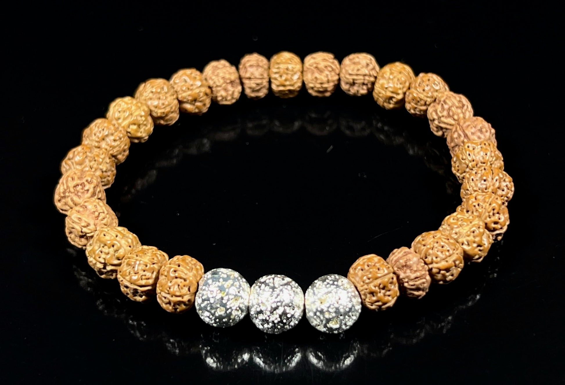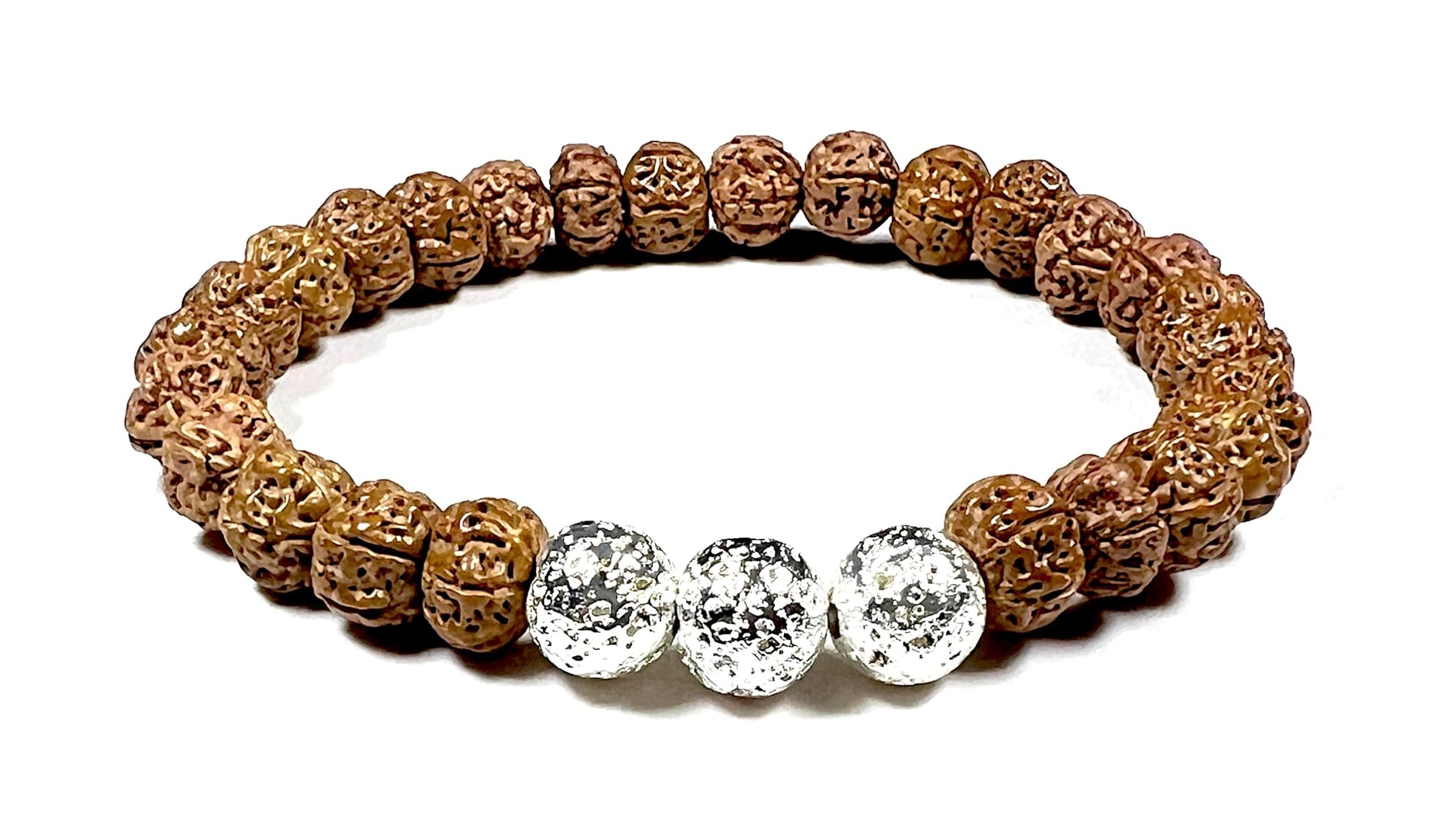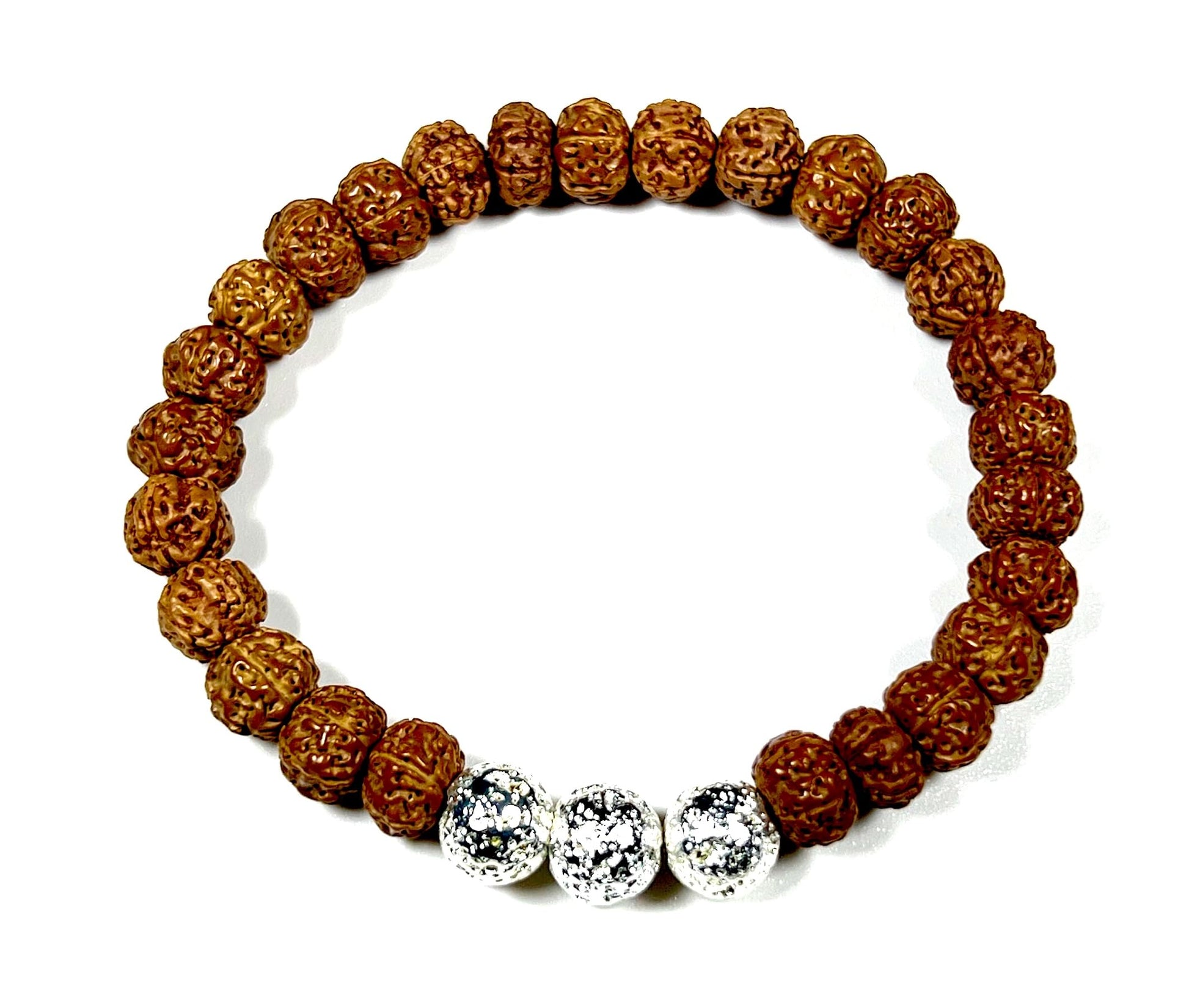 The VULCAN Rudraksha & Silver-Plated Lava Bracelet blends sacred tradition with modern edge. Featuring natural Rudraksha beads, lava stone, and silver-plated accent beads, this handmade 8mm stretch bracelet channels grounding energy and spiritual clarity.