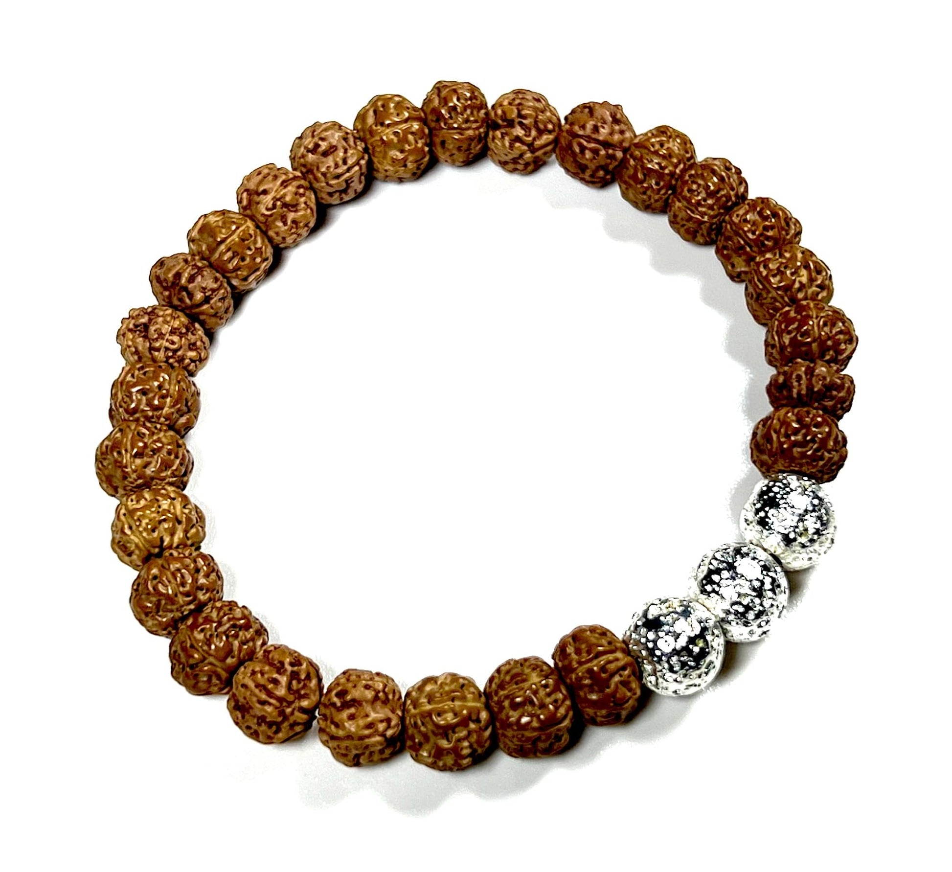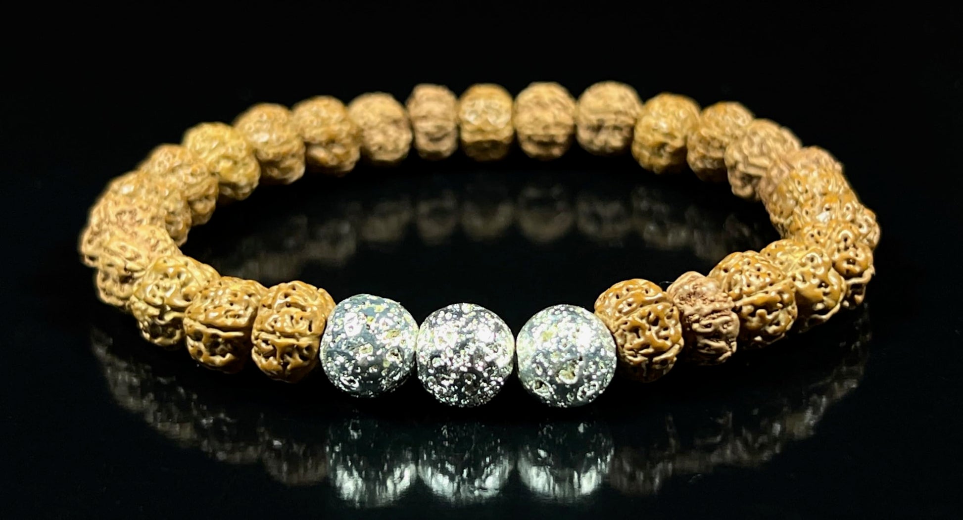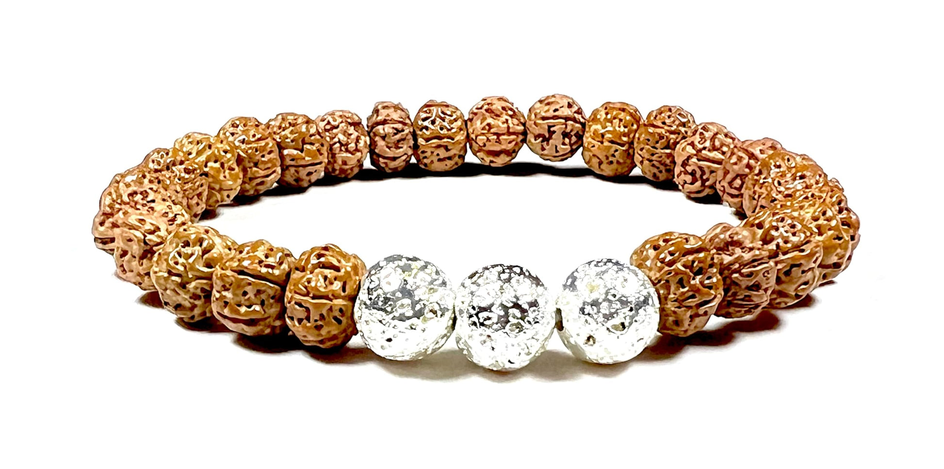 The VULCAN Rudraksha & Silver-Plated Lava Bracelet blends sacred tradition with modern edge. Featuring natural Rudraksha beads, lava stone, and silver-plated accent beads, this handmade 8mm stretch bracelet channels grounding energy and spiritual clarity.
