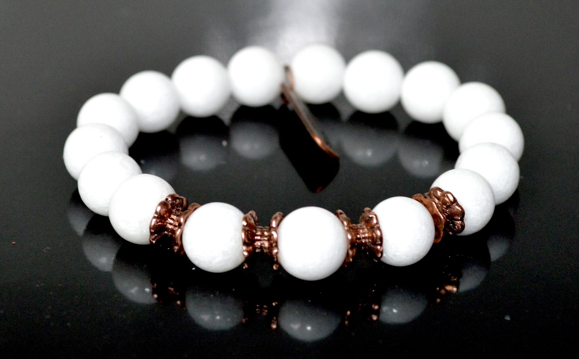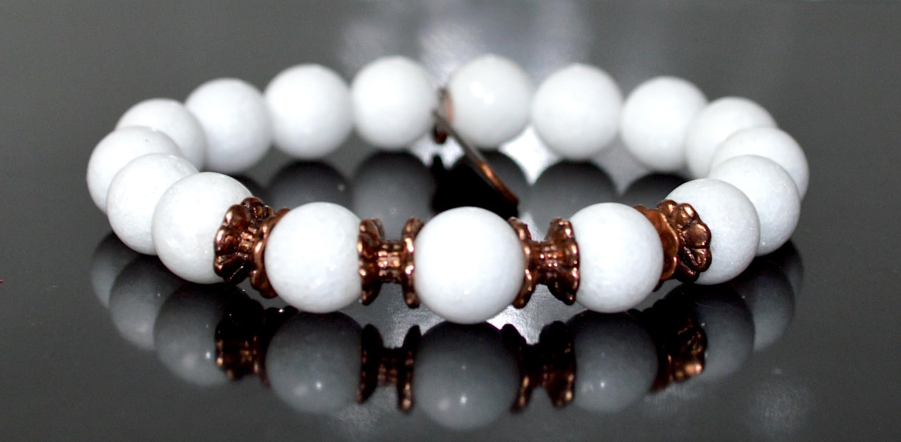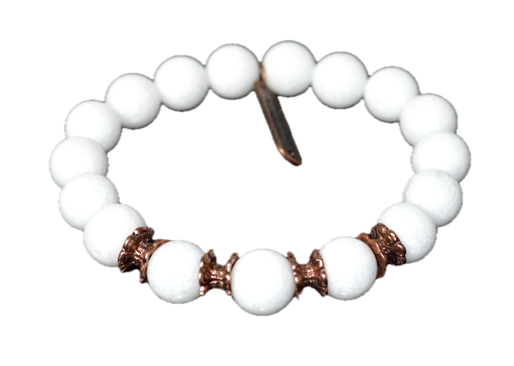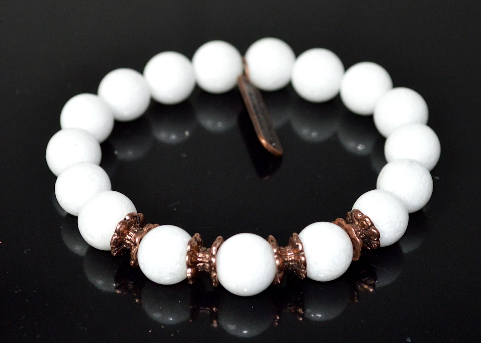 - This 10mm White Jade stretch bracelet, featuring antique bronze finish spacers, exudes both elegance and spiritual symbolism. White Jade is known for its serene beauty and is closely associated with the Heart Chakra, symbolizing emotional balance, harmony, and tranquility. The soft white tones of the Jade beads are elegantly contrasted with antique bronze finish spacers, adding a touch of vintage charm to this sophisticated piece.